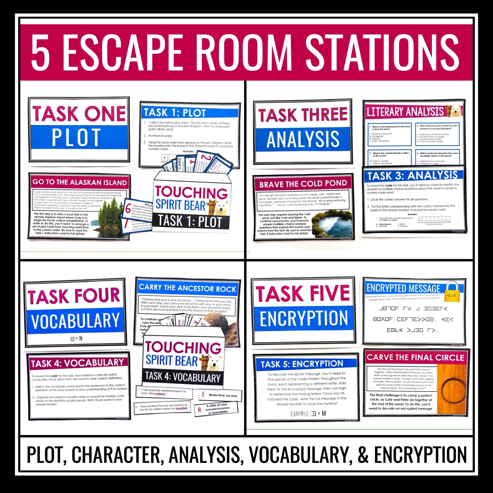Touching Spirit Bear Escape Room Review Activity for Ben Mikaelsen’s Novel: This activity is a fun and engaging way to have your students review the most important elements of Touching Spirit Bear by Ben Mikaelsen. Students will visit stations and complete puzzles and challenges related to the plot diagram, characterization, story elements, and vocabulary in the novel. This highly engaging, interactive escape room for Touching Spirit Bear will not only be the perfect ending activity for the novel, but it will also review and check their understanding of the text.