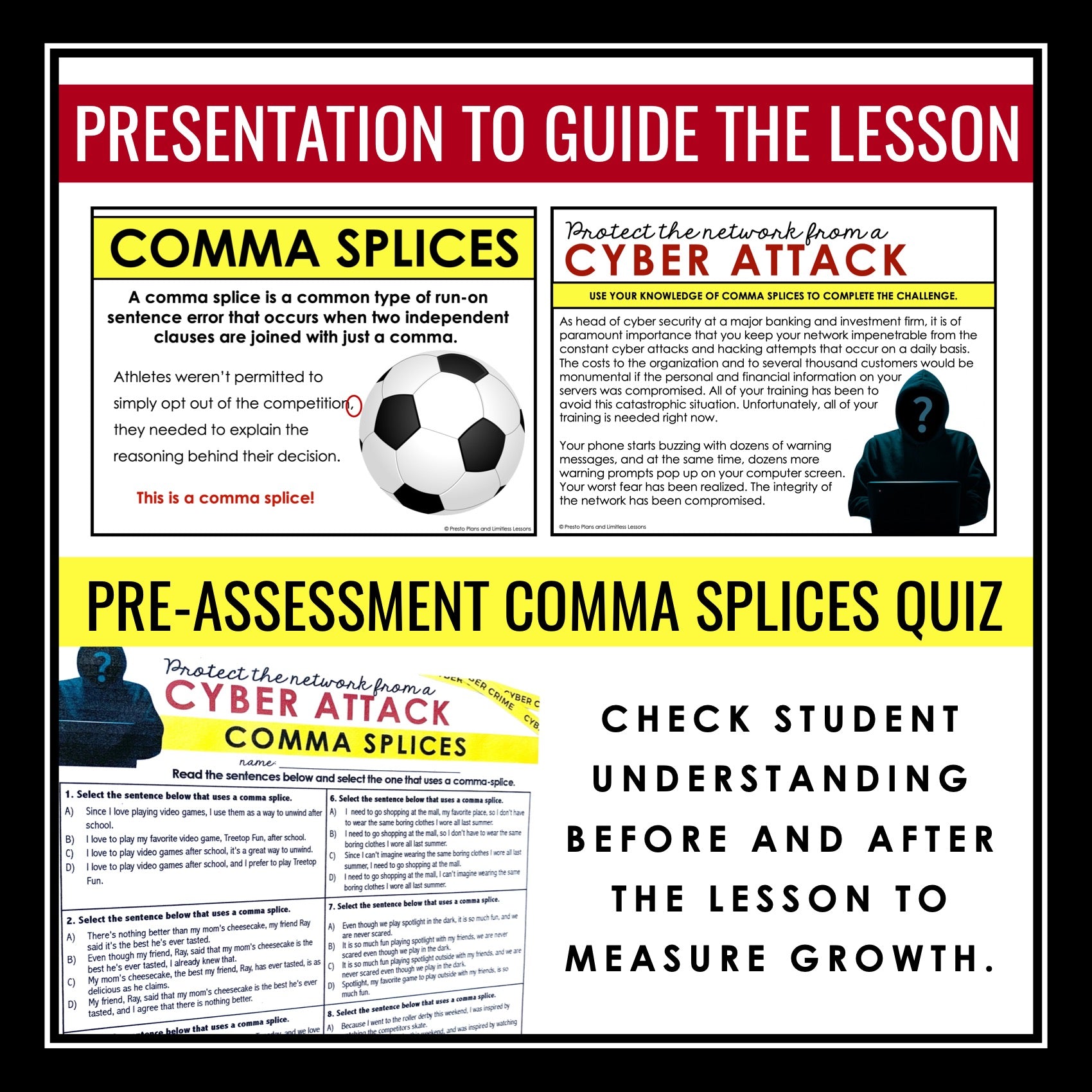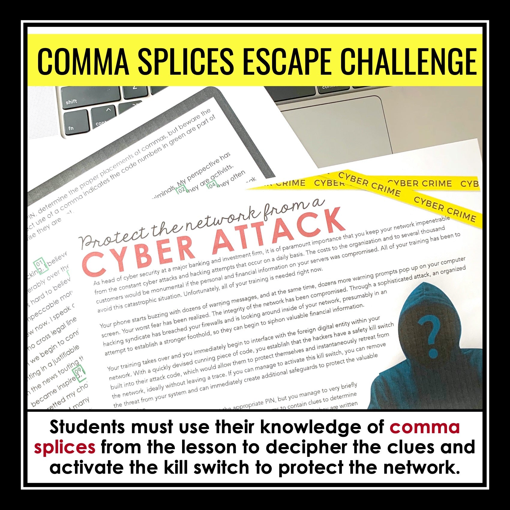 ➡️ Comma Splices Prevent the Cyber Attack Challenge: In this interactive escape-room style comma splices challenge, students must read a passage that includes a variety of comma splices. Once they find them all, they will use the instructions to reveal the PIN to access the kill switch that will stop the cyber attack.