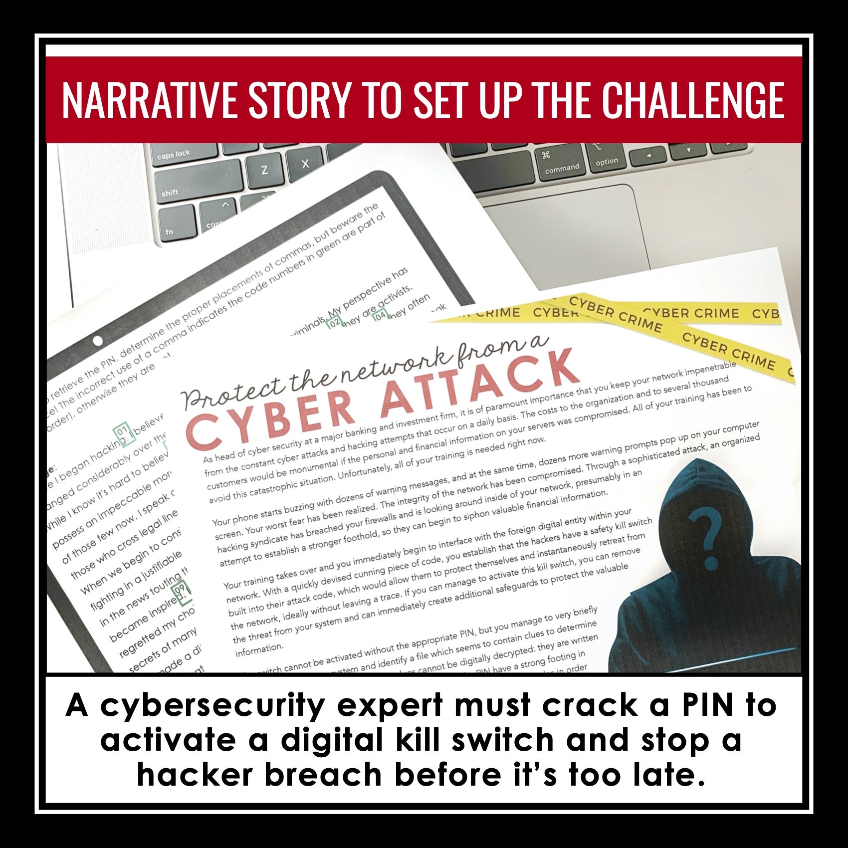 ➡️ Prevent the Cyber Attack Narrative Back Story: Next, students are ready to put what they have learned into action! They will begin the challenge by reading a short backstory that sets up the escape room challenge. Students are the head of cyber security at a major banking firm, and their worst fear has come true: hackers have breached the network. They've built a safety kill switch with a PIN, and students need to activate it fast. But the catch? The PIN clues are written in plain English, requiring strong grammatical skills to decipher. With time ticking, it's up to your students to decode the clues and protect the network.