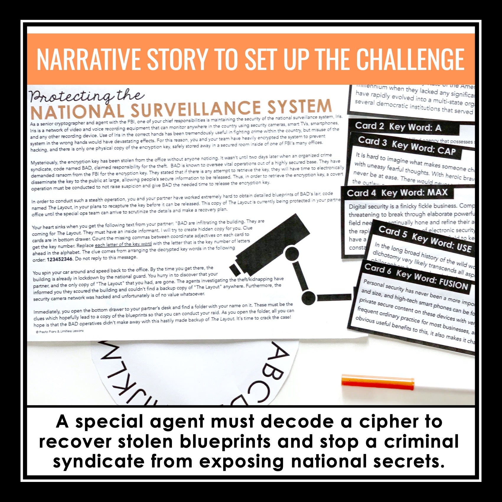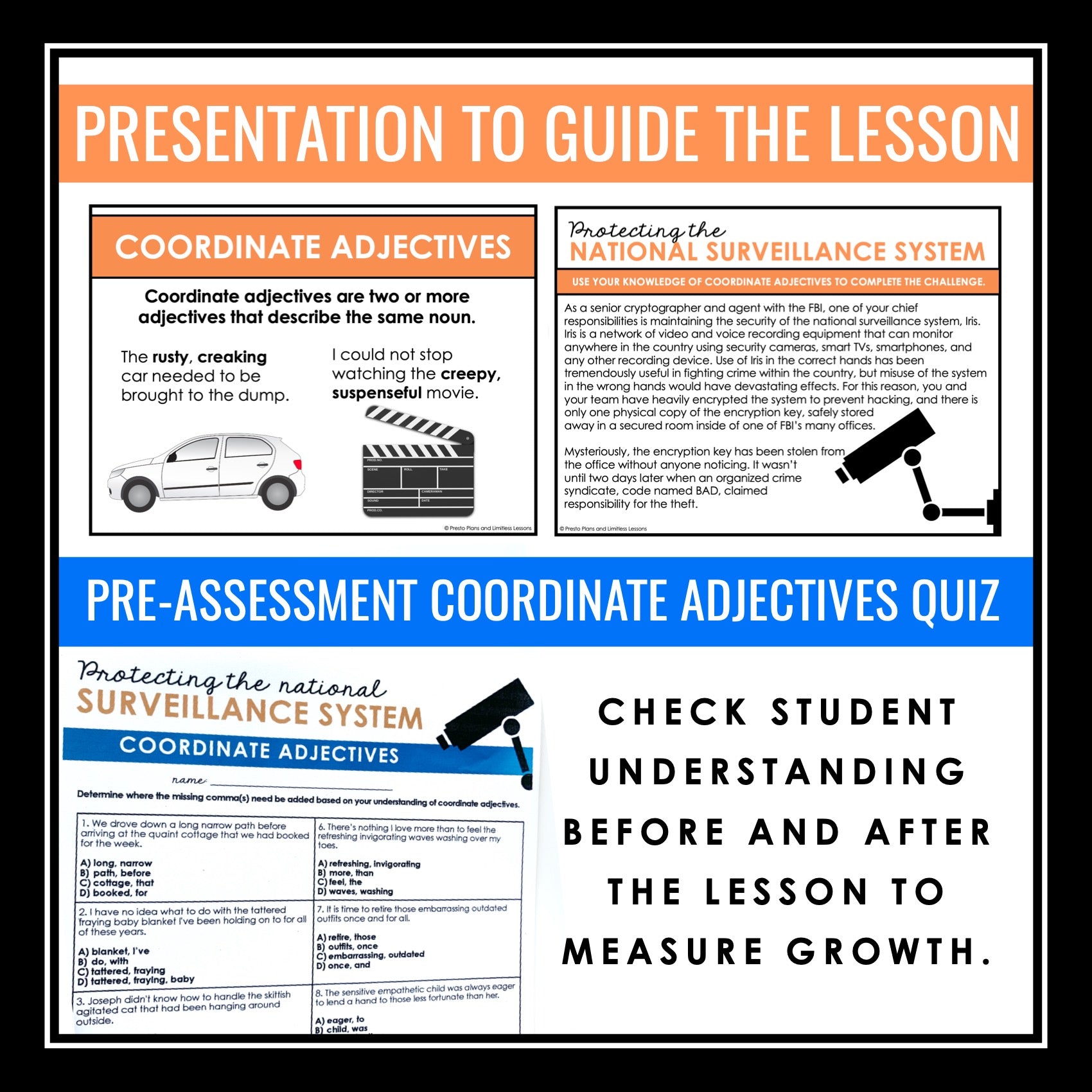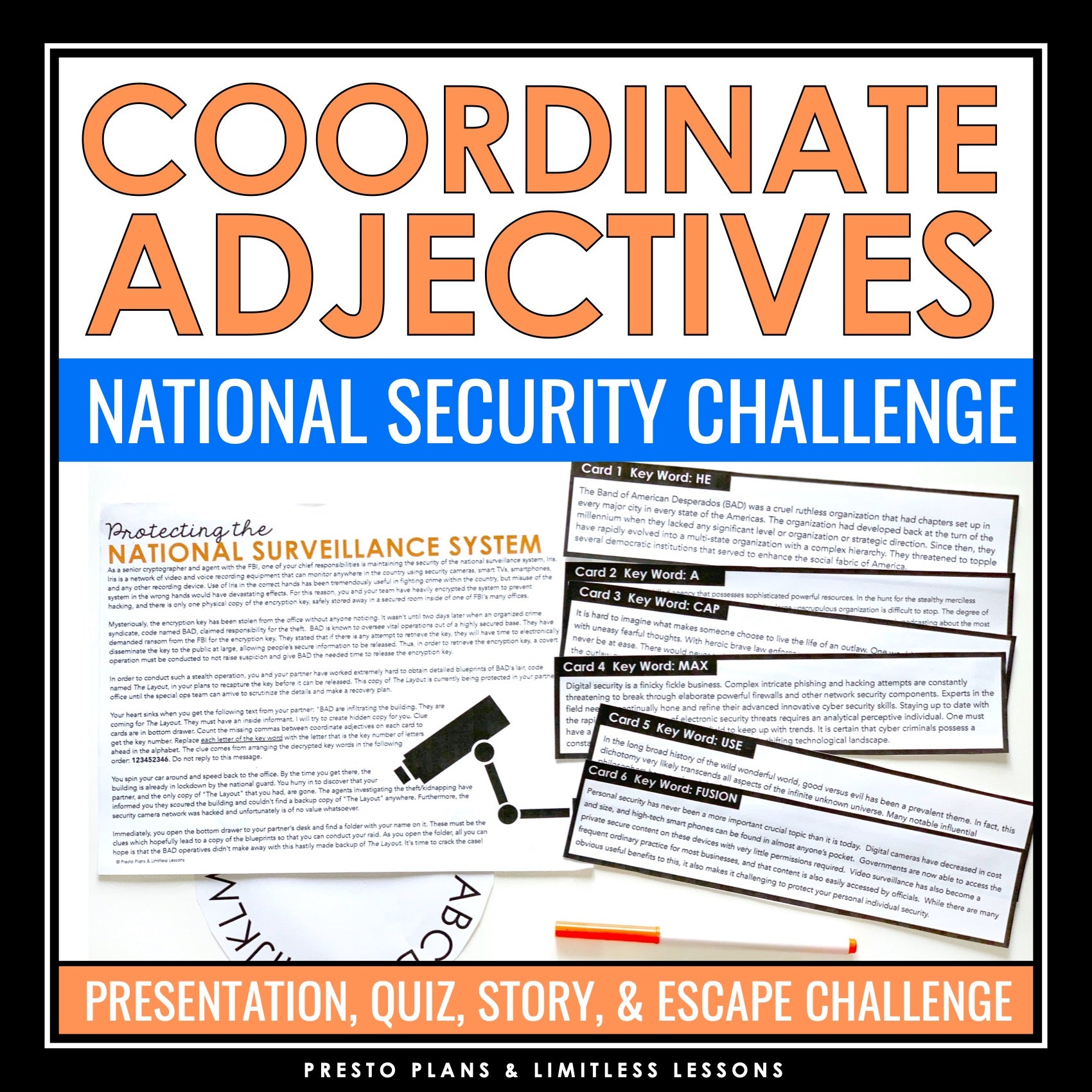 This coordinate adjectives grammar escape room style challenge is a new and fun way to engage your students and improve their understanding of how to use commas with coordinate adjectives! The detailed presentation introduces the comma rules with clear examples, ensuring student understanding from the start, and a pre or post-assessment quiz allows you to assess student understanding effectively. The highlight of the resource is the engaging escape room-style challenge, where students read an original narrative back story where they must retrieve a stolen encryption key for the FBI for national security. Then, they must collaborate in groups to crack a commas with coordinate adjectives-related challenge to find the missing blueprints before a crime syndicate does!