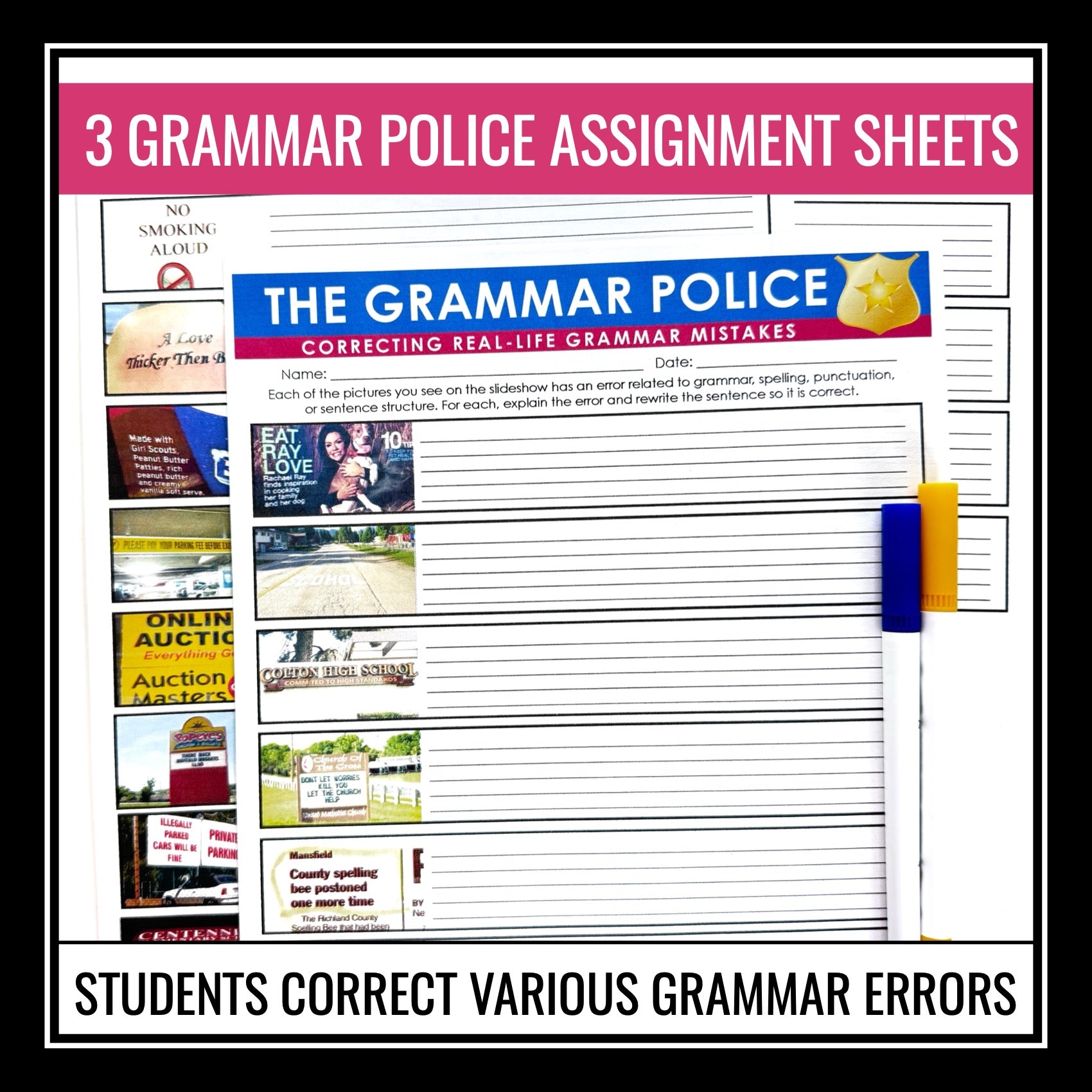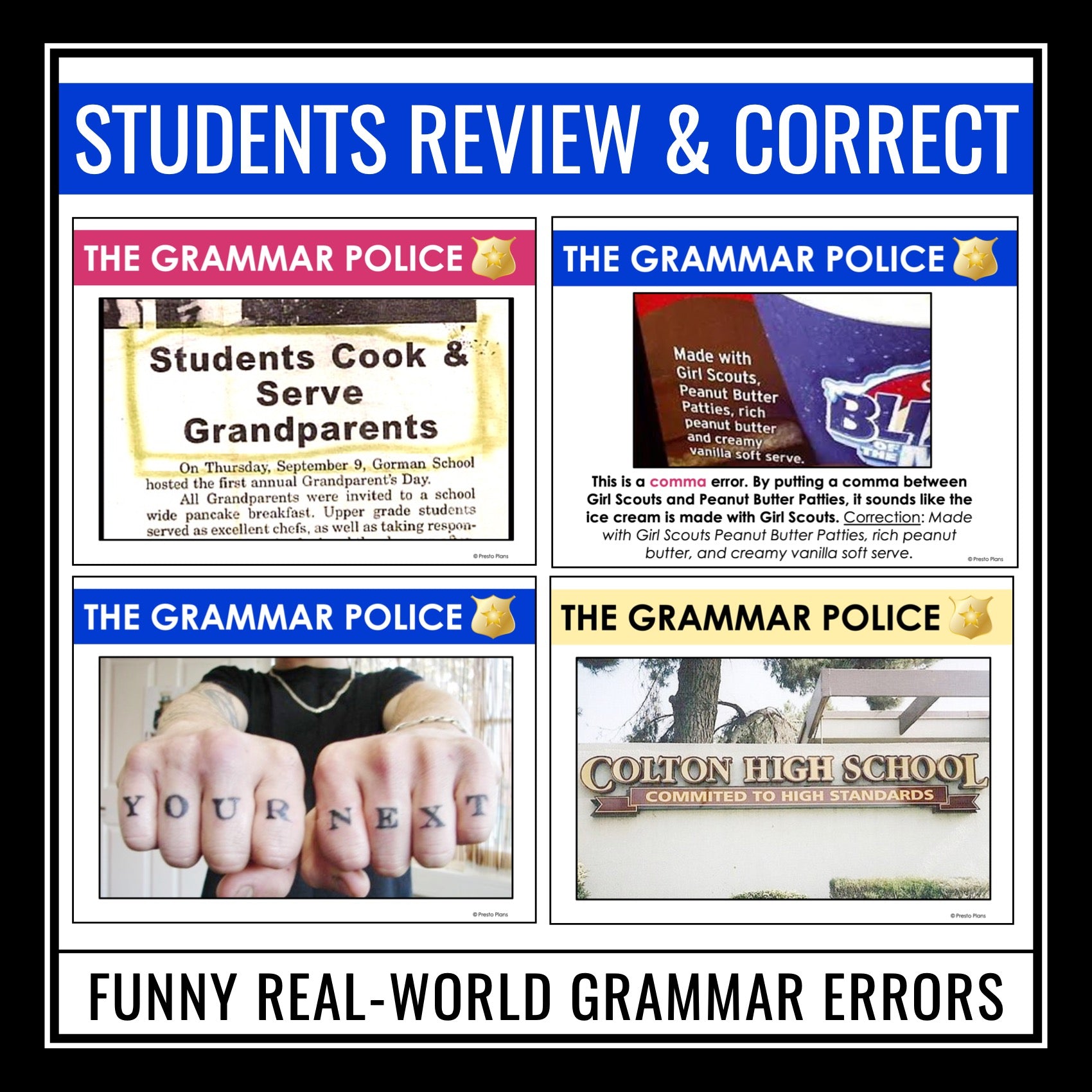 ➡️ Grammar Police Assignments: Improve student understanding and application of grammar rules with a comprehensive 3-page worksheet aligned with the presentation. Students will analyze the real-world examples, identify the grammar errors, and practice correcting them.