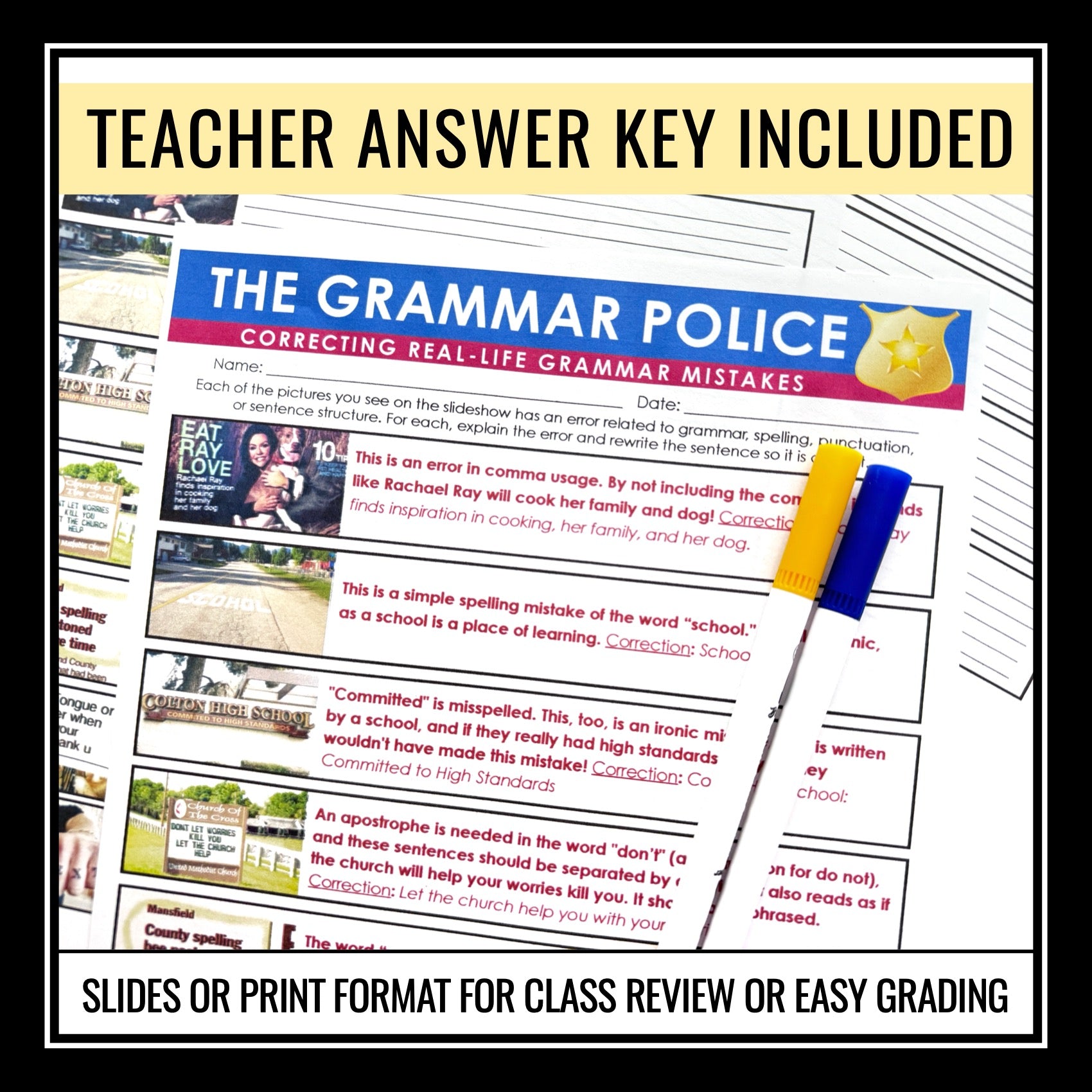➡️ Grammar in The Real World Presentation Slides: Engage students with a captivating 41-slide presentation featuring images showcasing real-world grammar errors. The examples are funny and engaging and will hook even your most reluctant students. Also included are detailed answer key slides that correct and explain each of the errors.