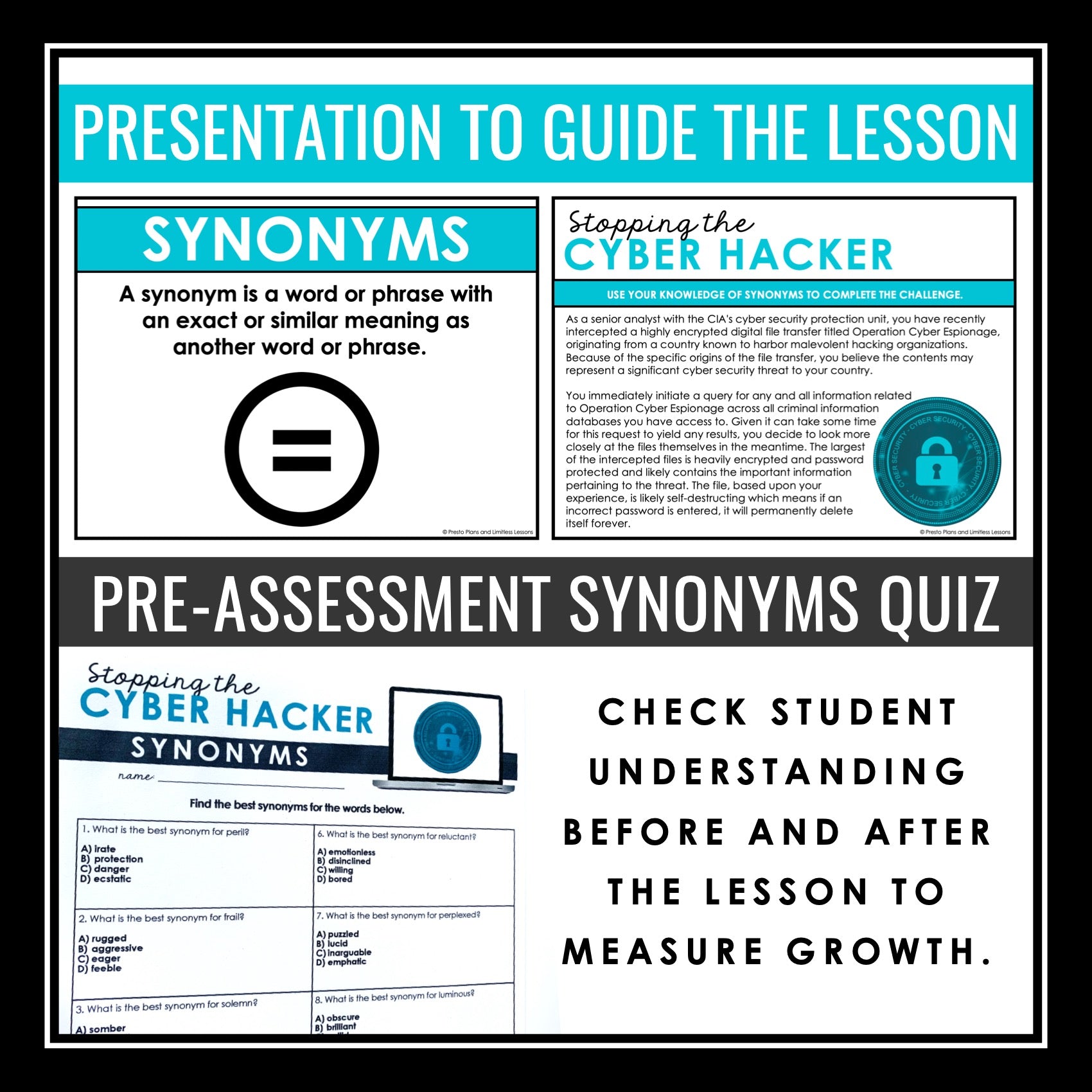 This synonyms vocabulary grammar escape room style challenge is a new and fun way to engage your students and improve their understanding of synonyms vocabulary! The detailed presentation introduces synonyms vocabulary with clear examples, ensuring student understanding from the start, and a pre or post-assessment quiz allows you to assess student understanding effectively. The highlight of the resource is the engaging escape room-style challenge, where students read an original narrative back story where they must stop the cyber hacker. Then, they must collaborate in groups to crack a synonyms vocabulary-related challenge to reveal a secret passphrase needed to keep the sensitive information safe!