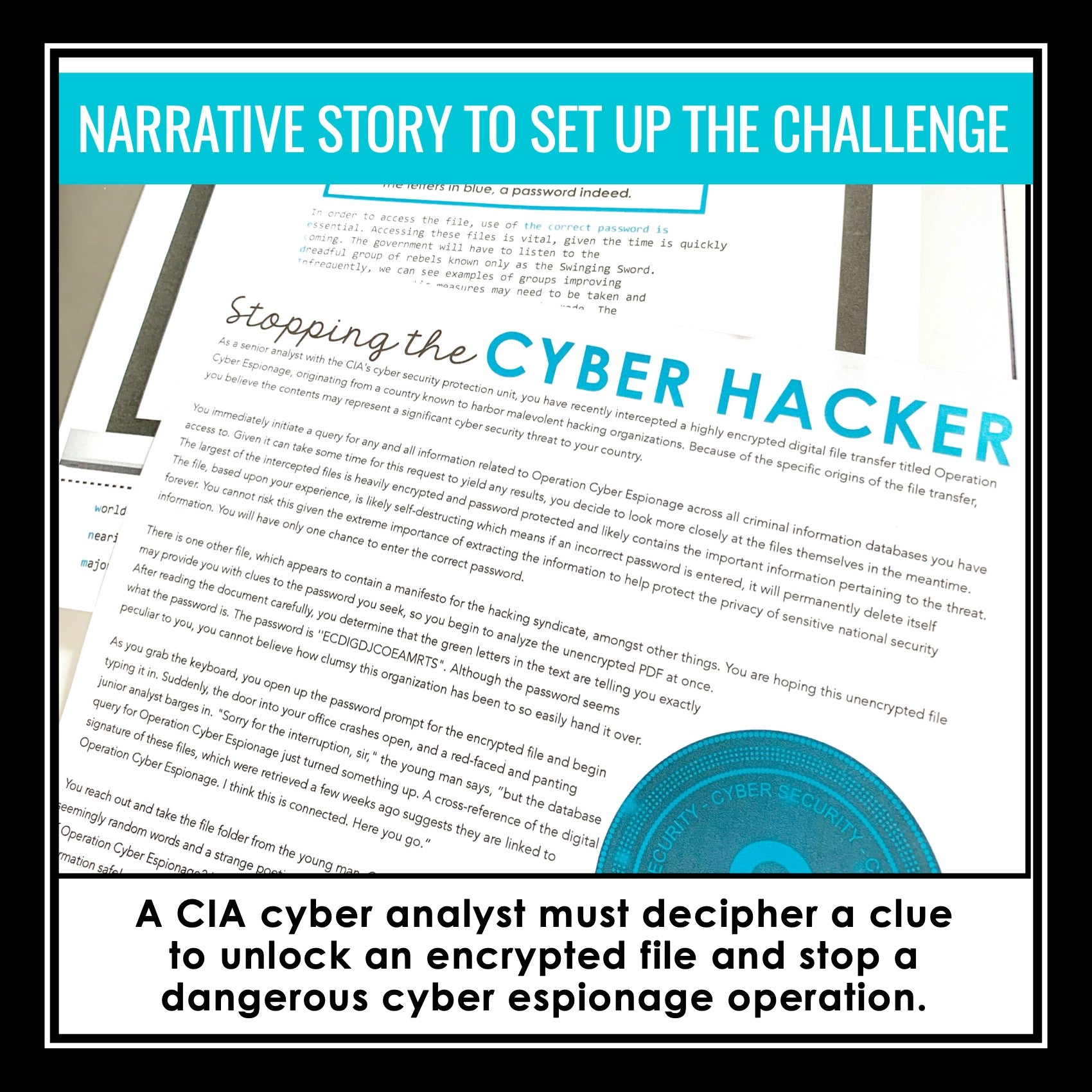 ➡️ Stop The Cyber Hacker Narrative Back Story: Next, students are ready to put what they have learned into action! They will begin the challenge by reading a short backstory that sets up the escape room challenge. Students play the role of a high-level tech expert who must use their knowledge to stop a hacker and uncover crucial information about a cyber security threat. They must decipher clues to the password needed to safeguard sensitive national security data.
