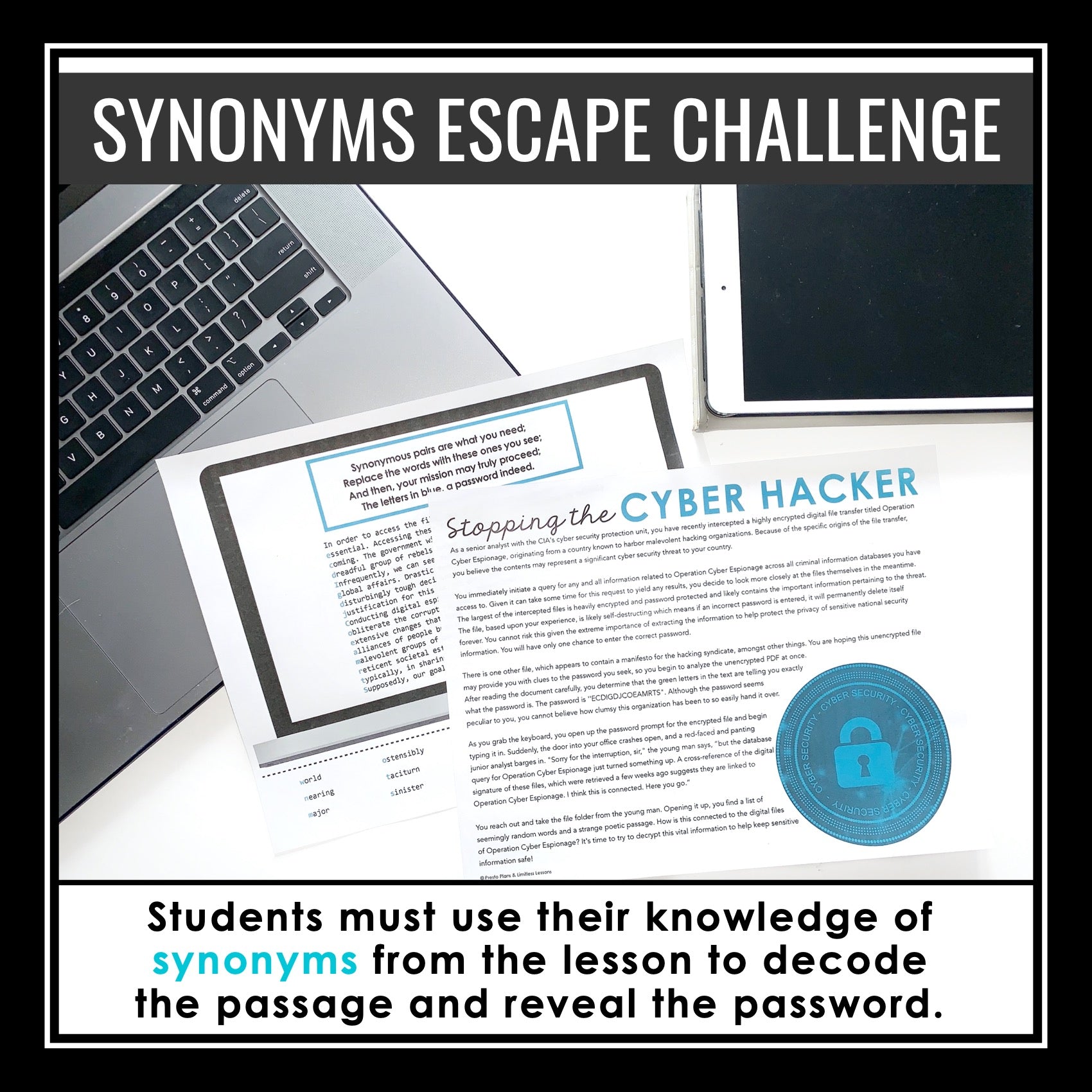 ➡️ Synonyms Vocabulary Stop The Cyber Hacker Escape Room Style Challenge: In this interactive escape-room style synonyms vocabulary challenge, students must read a passage and replace words with their synonyms to reveal a secret passphrase needed to keep the sensitive information safe.