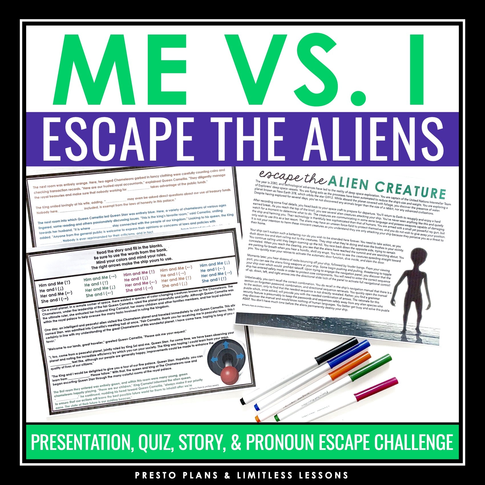 This pronouns grammar escape room style challenge is a new and fun way to engage your students and improve their understanding of the difference between using me and I as a subject and an object of the sentence! The detailed presentation introduces information on when to use the pronouns me and I with clear examples, ensuring student understanding from the start, and a pre or post-assessment quiz allows you to assess student understanding effectively. The highlight of the resource is the engaging escape room-style challenge, where students read an original narrative back story where they must escape an alien creature. Then, they must collaborate in groups to crack a pronoun-related challenge to unlock the solution to escape the alien!