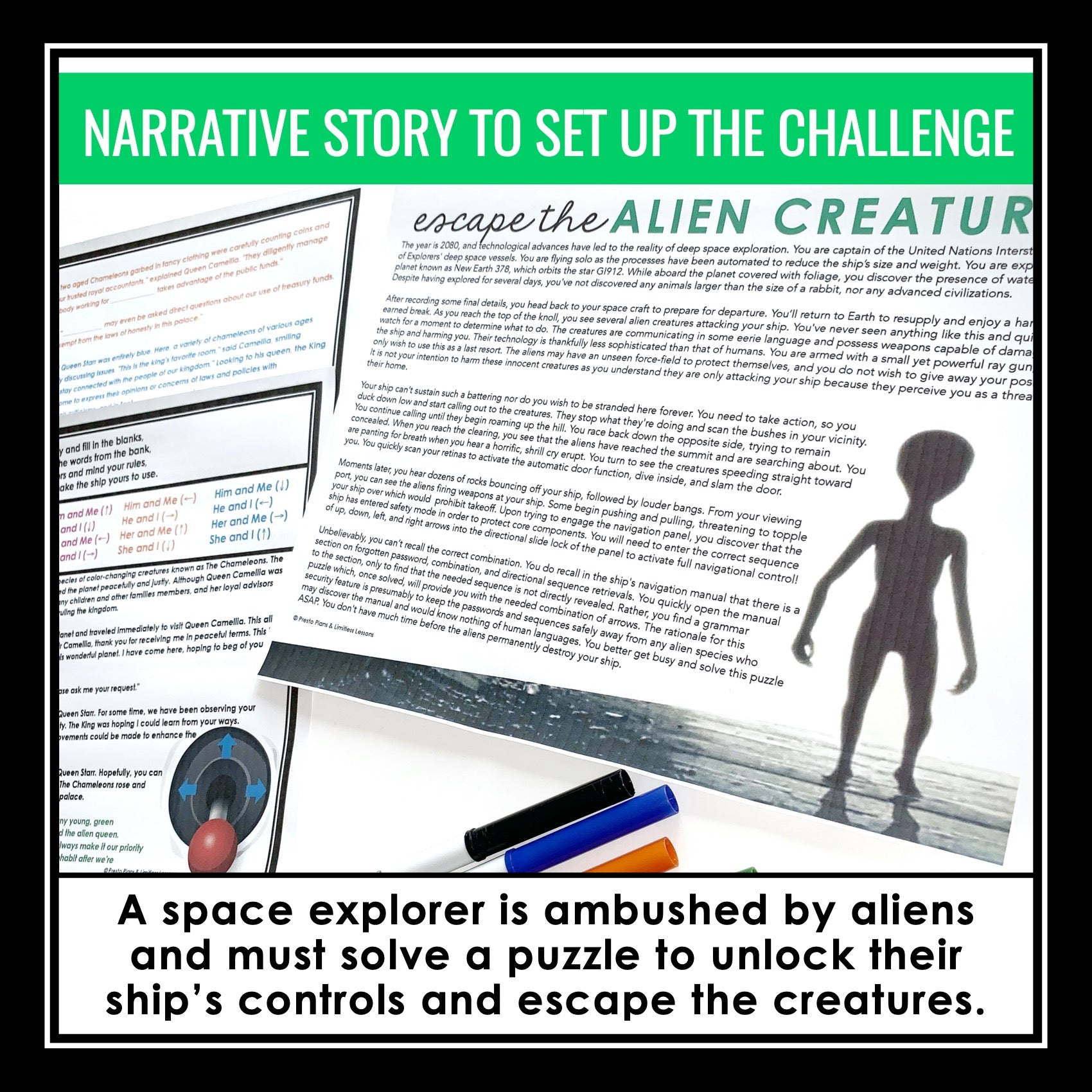➡️ Escape the Alien Narrative Back Story: Next, students are ready to put what they have learned into action! They will begin the challenge by reading a short backstory that sets up the escape room challenge. Students are explorers on a planet in the future and must defend their ship from alien attackers! To regain control, they must solve a grammar puzzle hidden in the ship's manual to activate the navigation system.