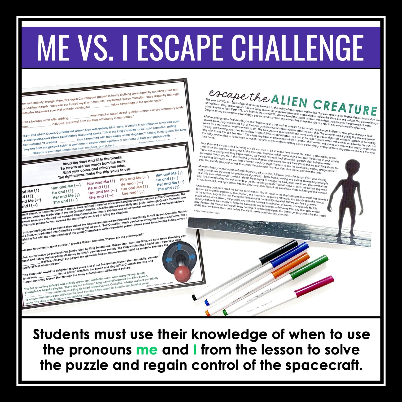 ➡️ Me vs. I Pronouns Alien Escape Room Style Challenge: In this interactive escape-room style me vs. I challenge, students must read a passage and move in different directions, showing their knowledge of me vs. I pronouns to get the directional sequence to activate the navigation system.