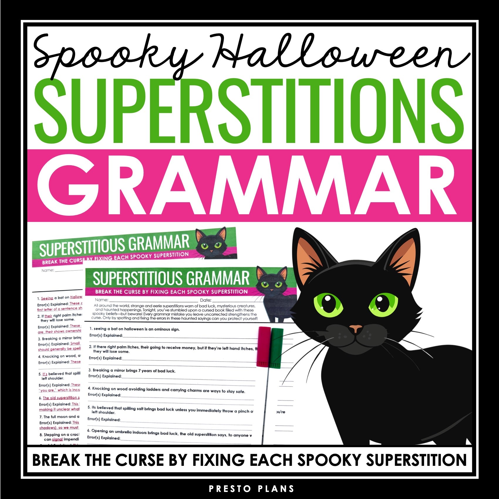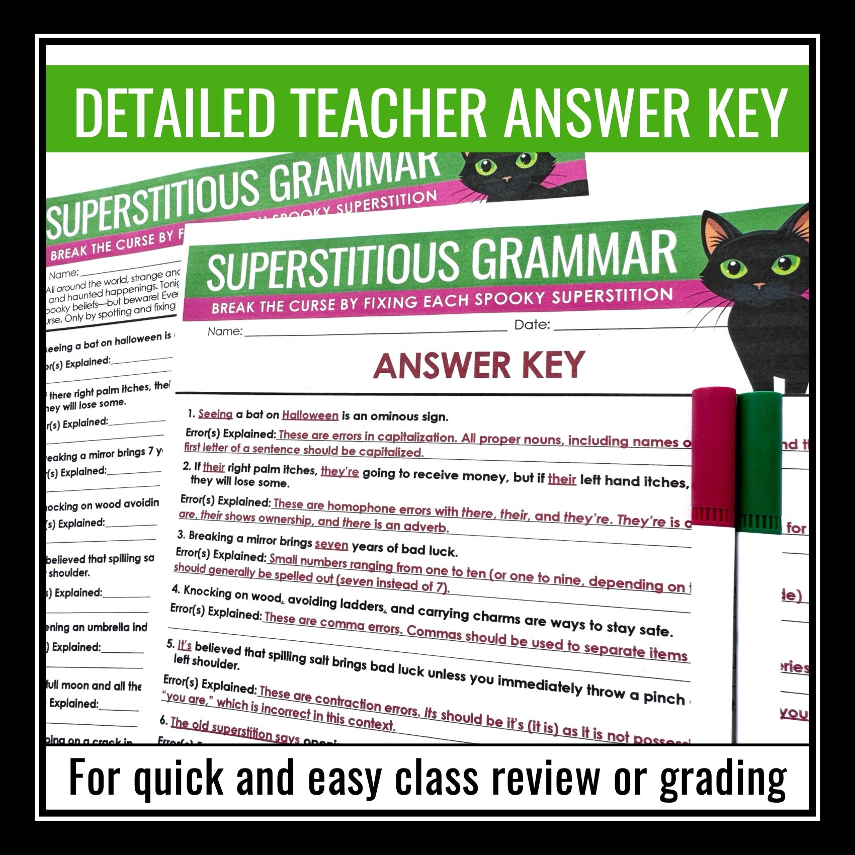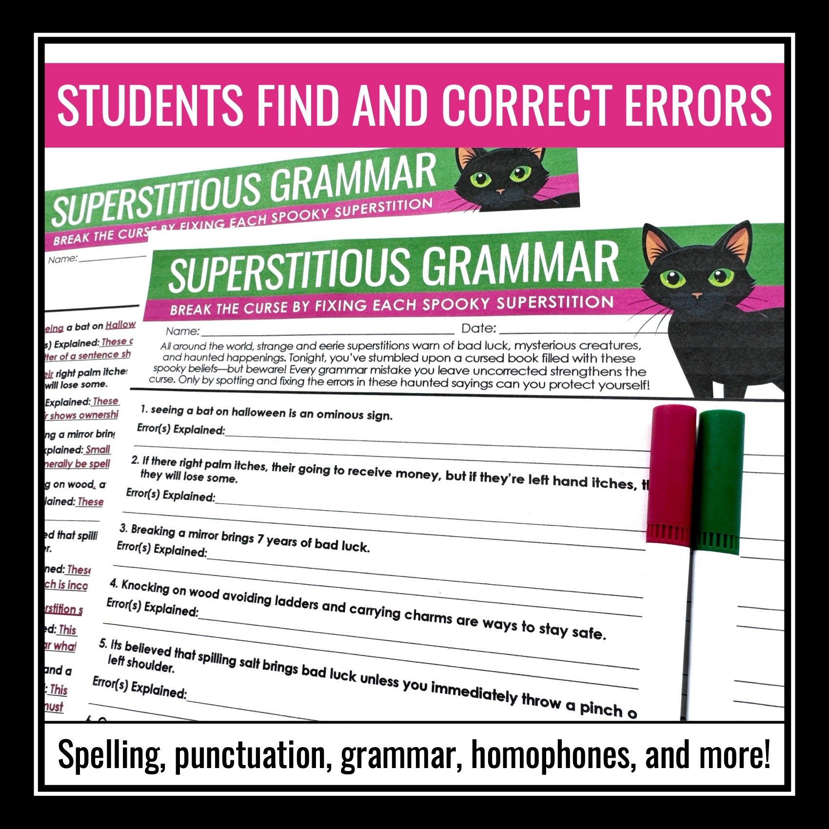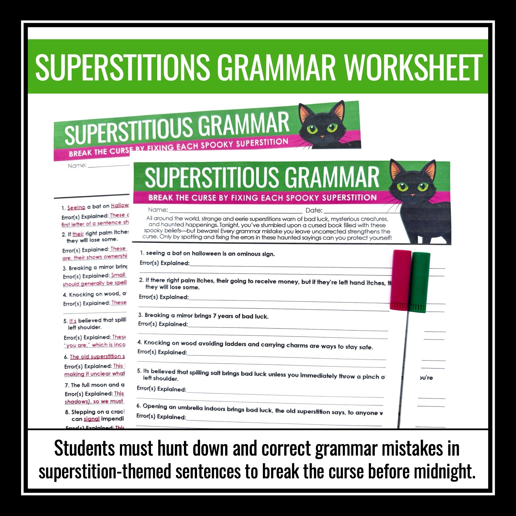 ➡️ Superstitions-Themed Grammar Worksheet Assignment: Students work through spooky superstition-themed sentences where they must correct grammar, spelling, and punctuation mistakes to break the curse. From black cats to broken mirrors, each corrected superstition helps them escape a world of spooky bad luck!