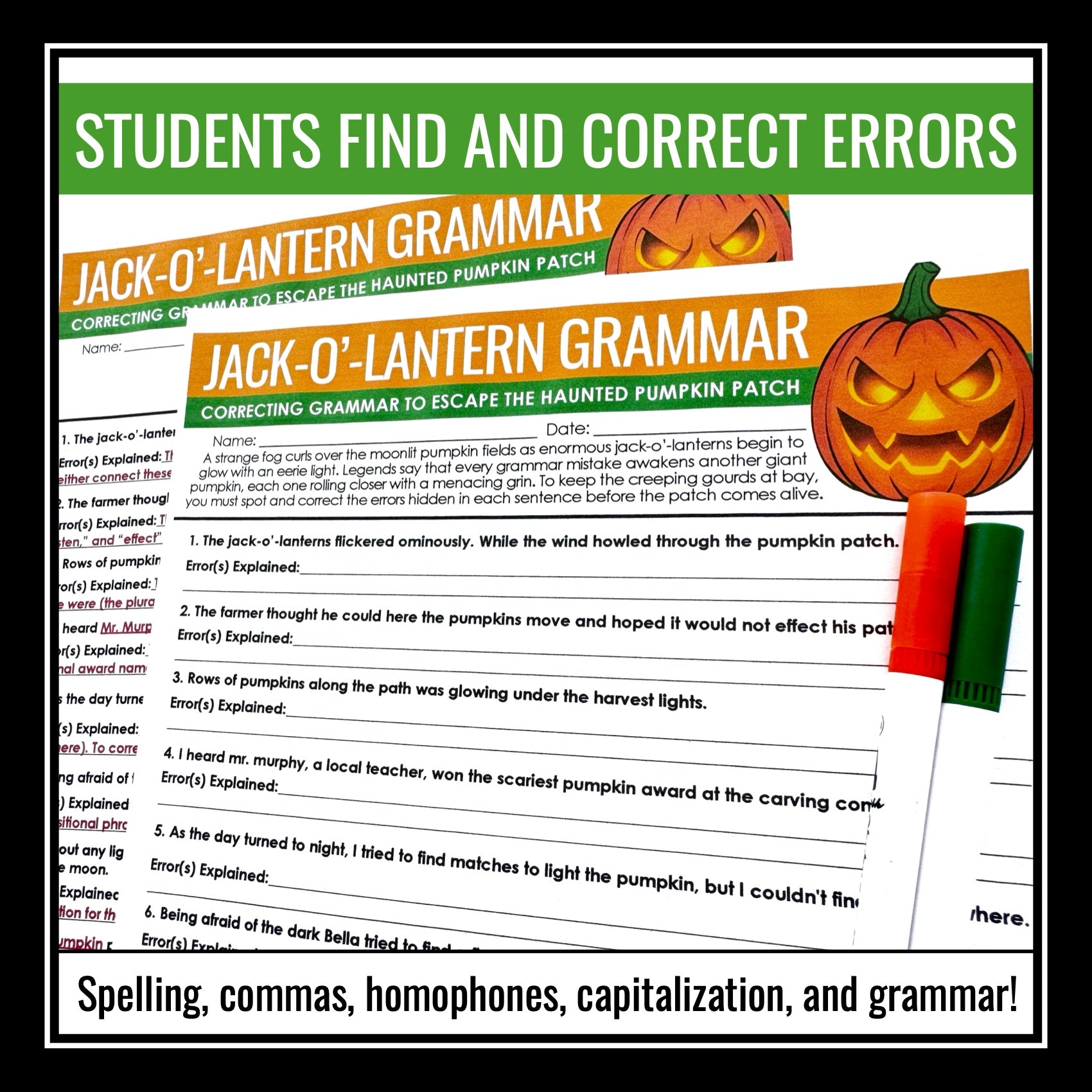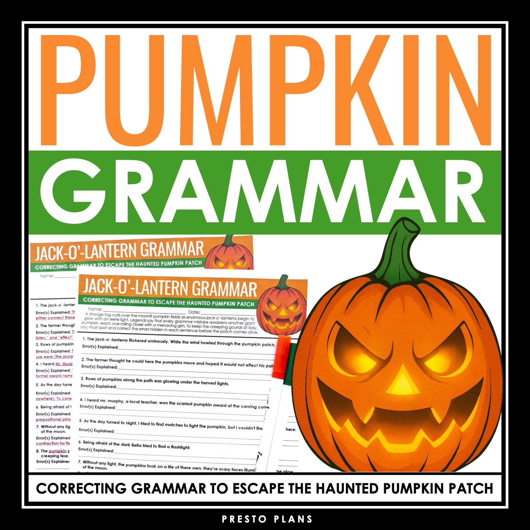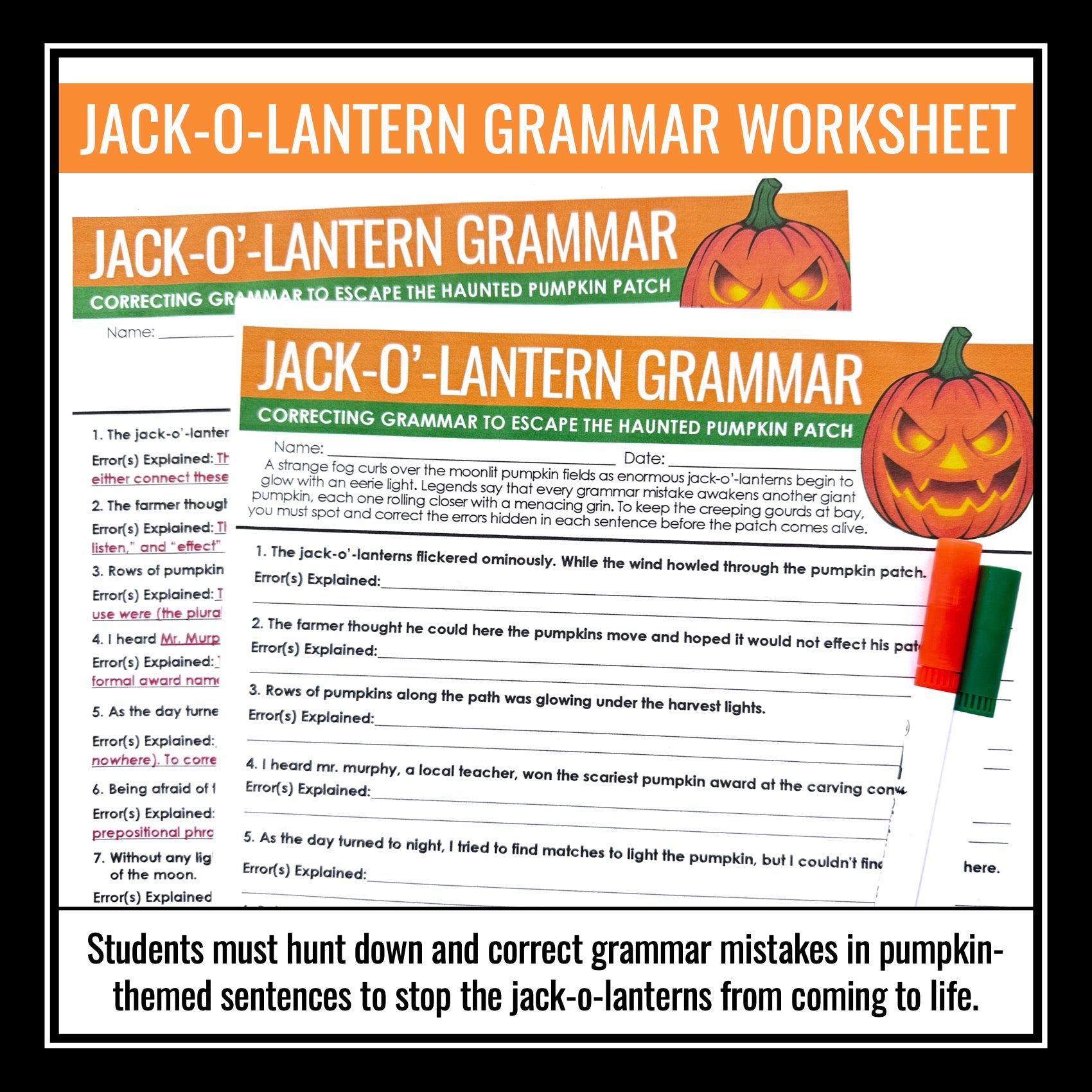 Halloween Grammar Worksheet Assignment - Grammar Editing Activity - Pumpkins: Step into the haunted pumpkin patch for a spooky Halloween grammar challenge! In this Halloween grammar activity, students find themselves surrounded by eerie jack-o’-lanterns. As they work through pumpkin-themed sentences filled with errors, students must use their grammar skills to fix each one before the pumpkins come alive. Tis creative Halloween grammar worksheet keeps students engaged while improving essential grammar skills.
