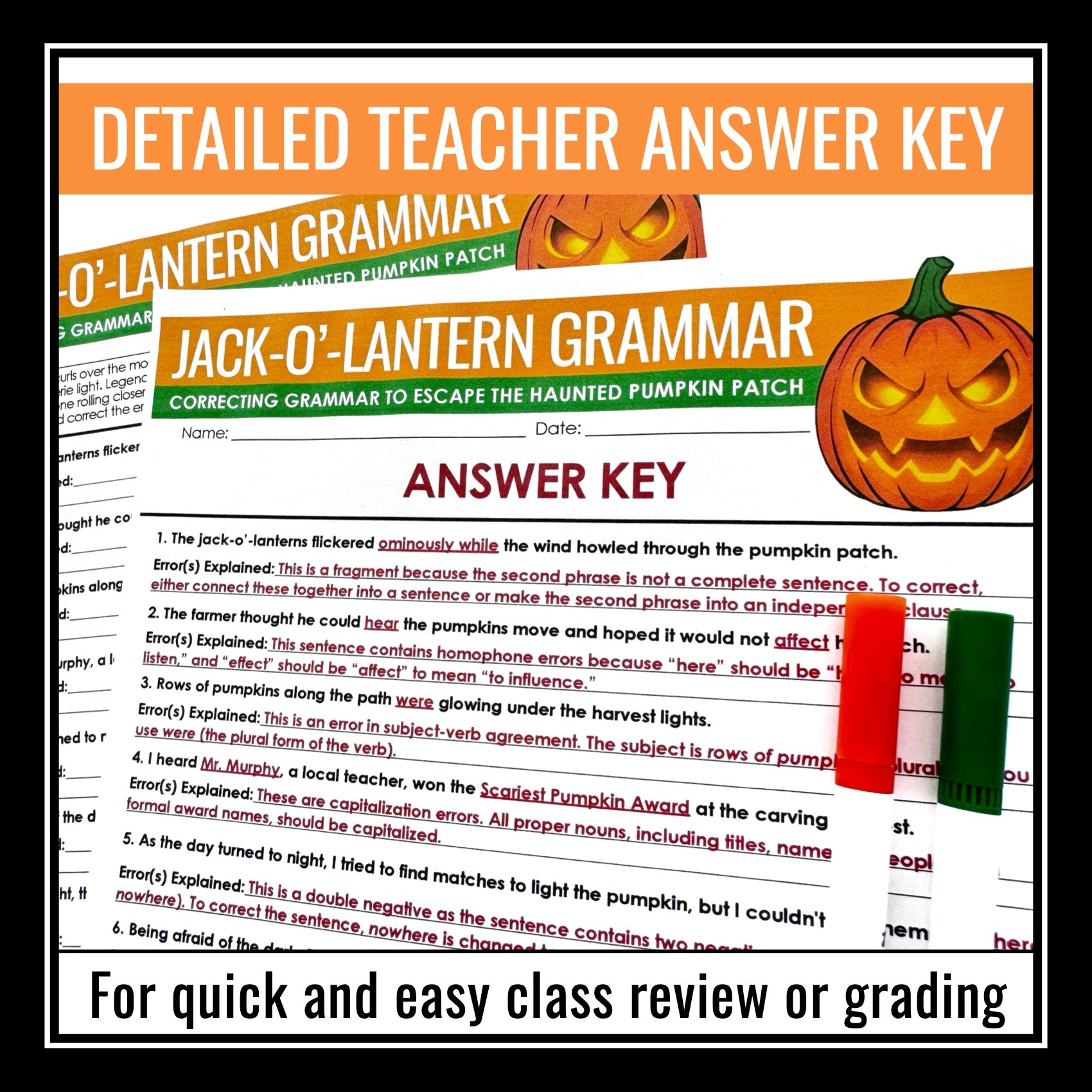 ➡️ Pumpkin Halloween Grammar Assignment Answer Key: Includes a detailed teacher answer key with each sentence corrected and every error explained. Use it to review the worksheet with your students, guide class discussion, or provide quick assessment and feedback.