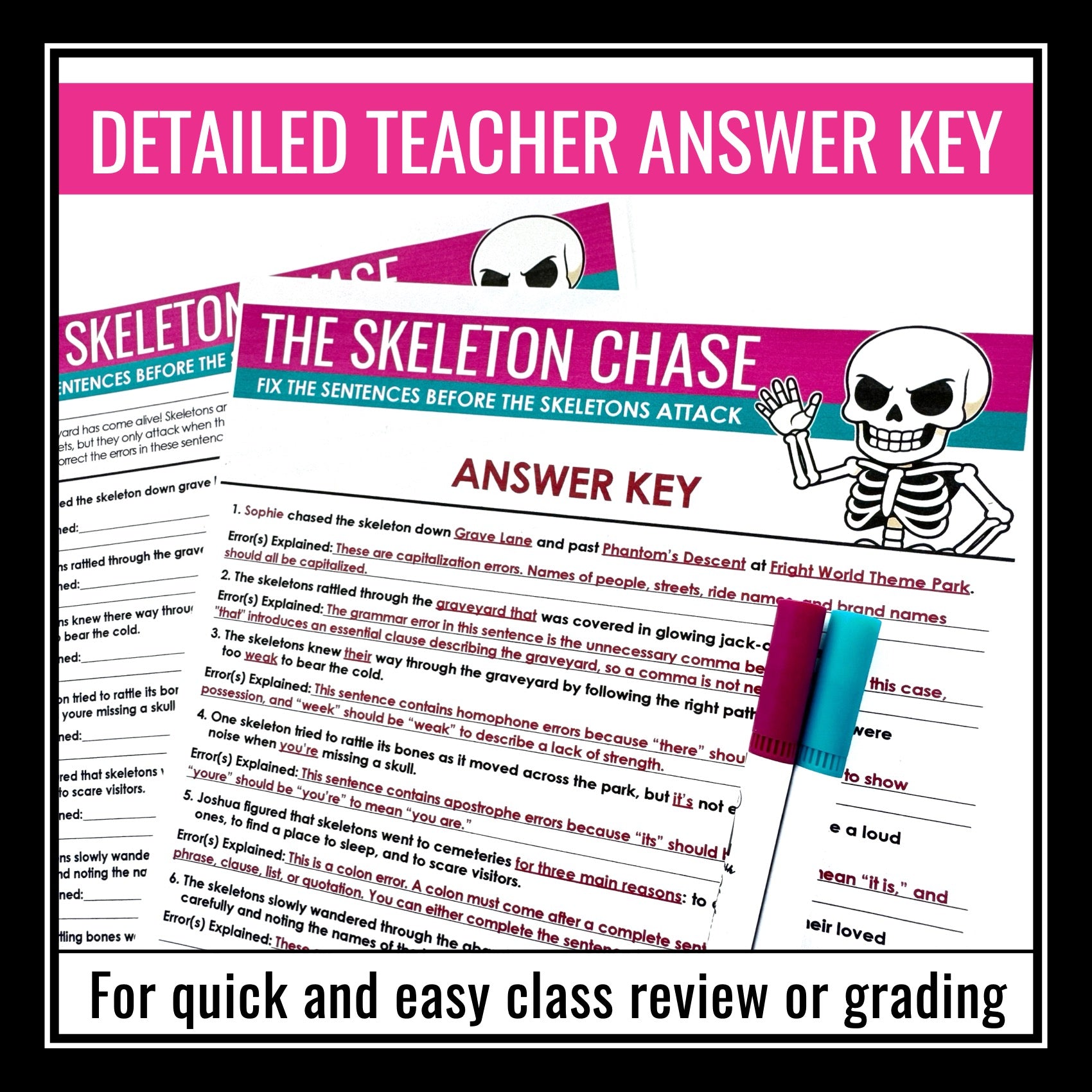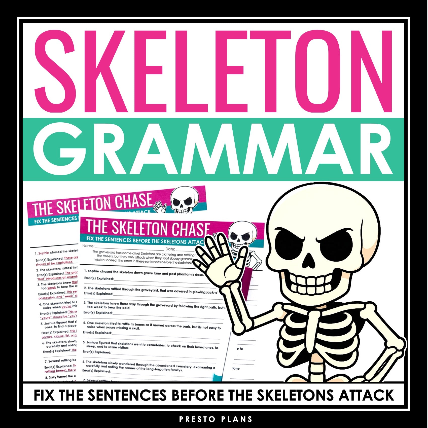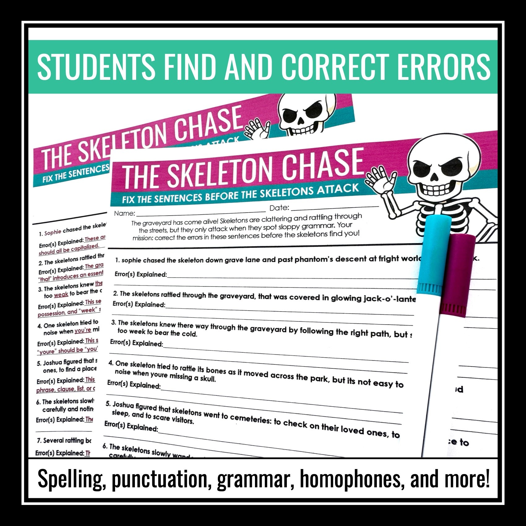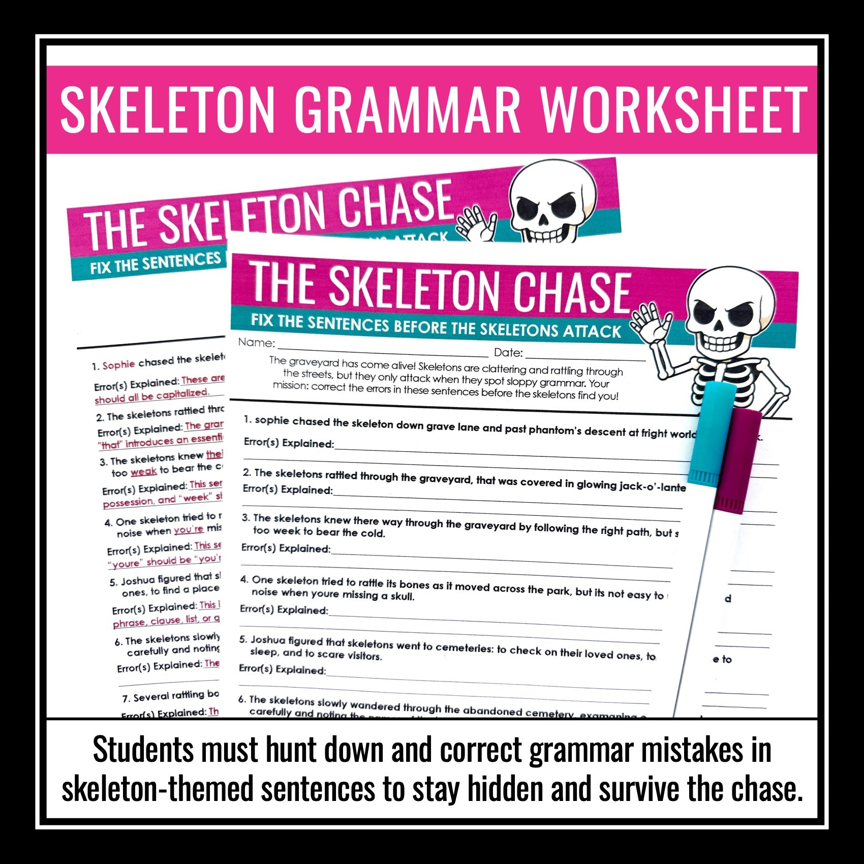 Halloween Grammar Worksheet Assignment - Grammar Editing Activity - Skeletons: In this Halloween grammar activity, students enter a spooky graveyard where skeletons come to life at the first sign of a grammar mistake. As they work through eerie, skeleton-themed sentences filled with grammatical errors, students must use their grammar skills to correct each one before the skeletons attack. This creative Halloween grammar worksheet keeps students engaged while reinforcing key grammar and writing skills.