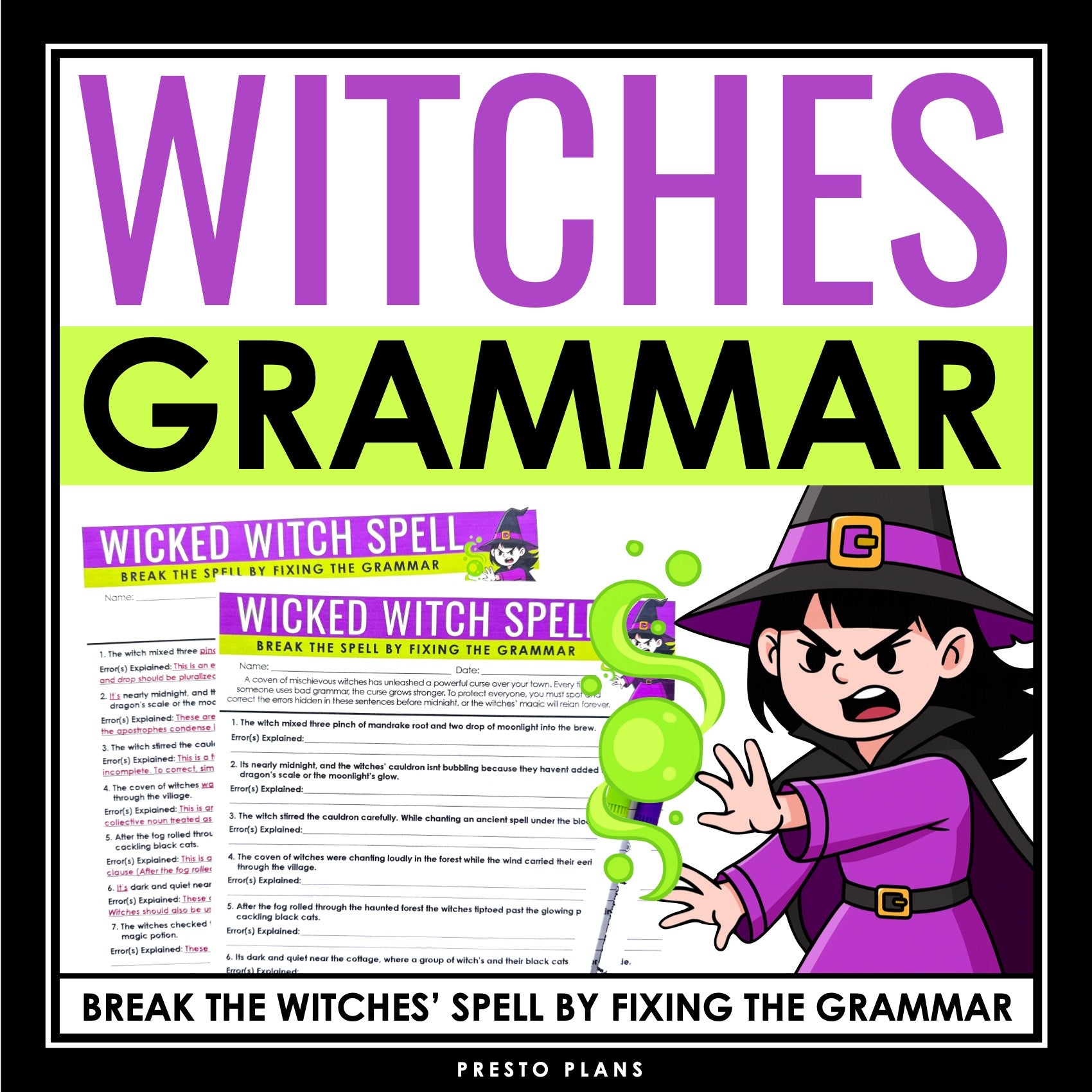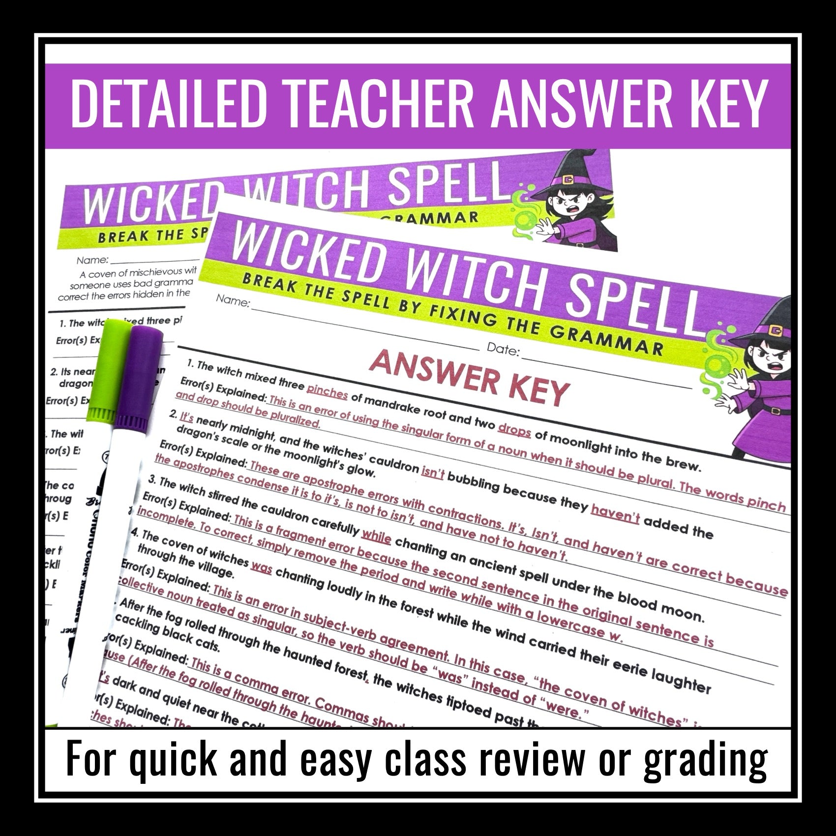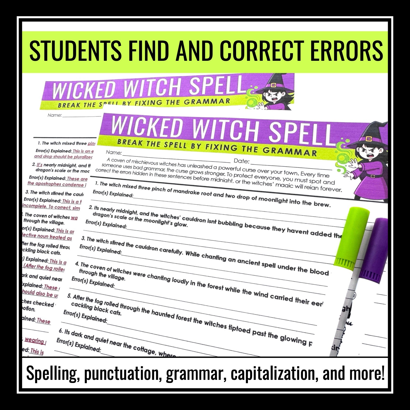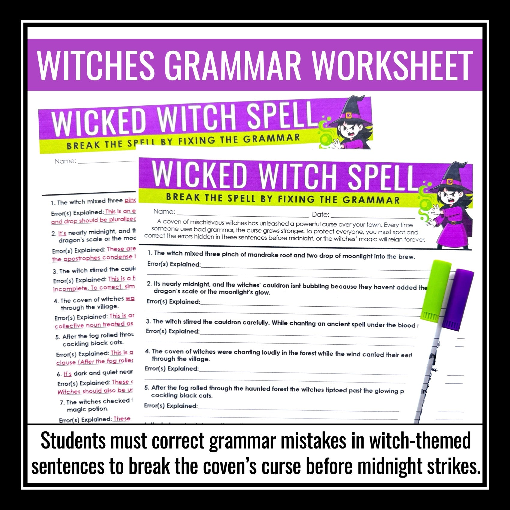 Halloween Grammar Worksheet Assignment - Grammar Editing Activity - Witches: Enter the witches’ forest in this magical Halloween grammar activity! A coven of mischievous witches has cast a powerful curse over the town, and every grammar mistake strengthens their spell. Students must correct each error before midnight to break the enchantment and stop the witches’ magic from spreading. This creative Halloween grammar worksheet keeps students engaged while building essential grammar skills.