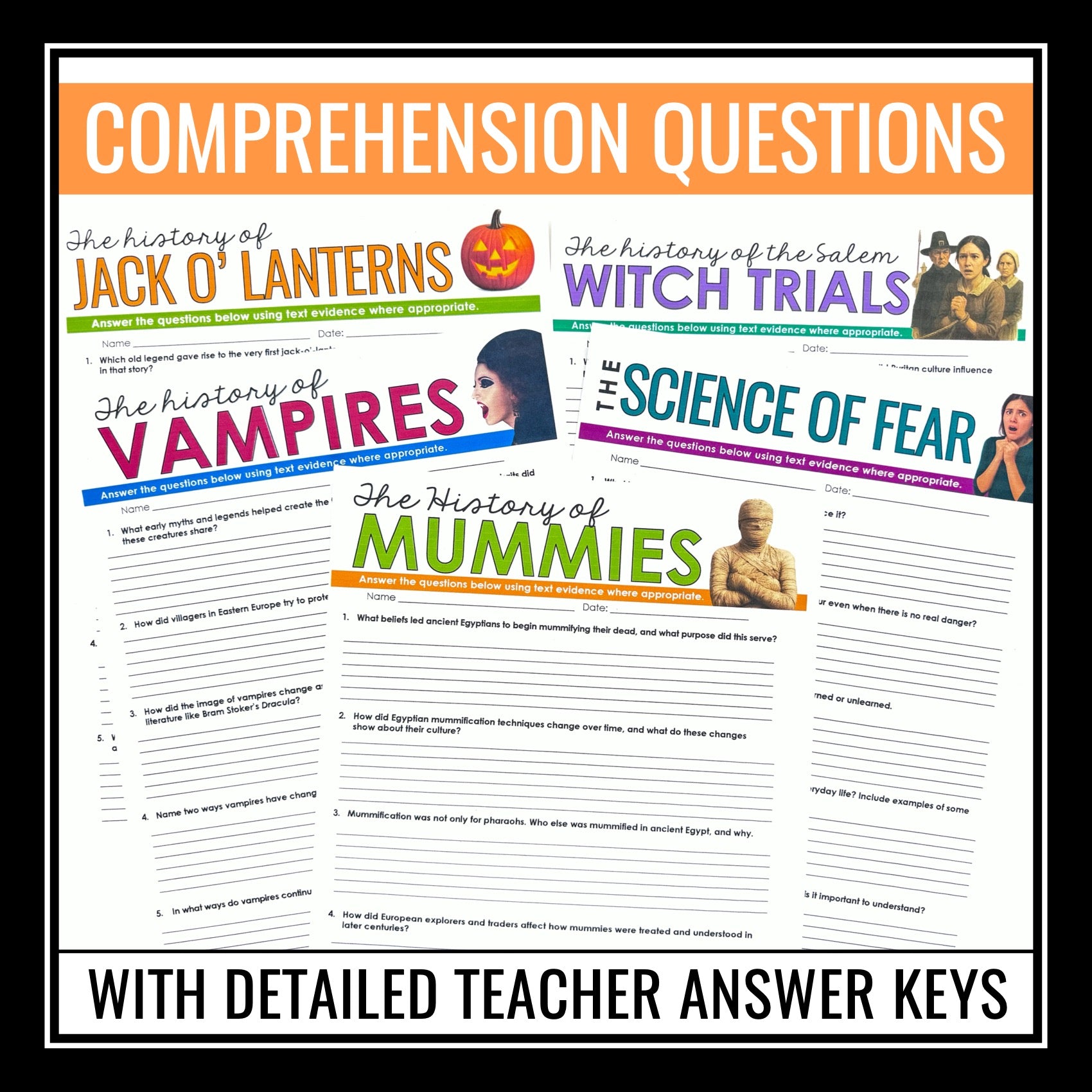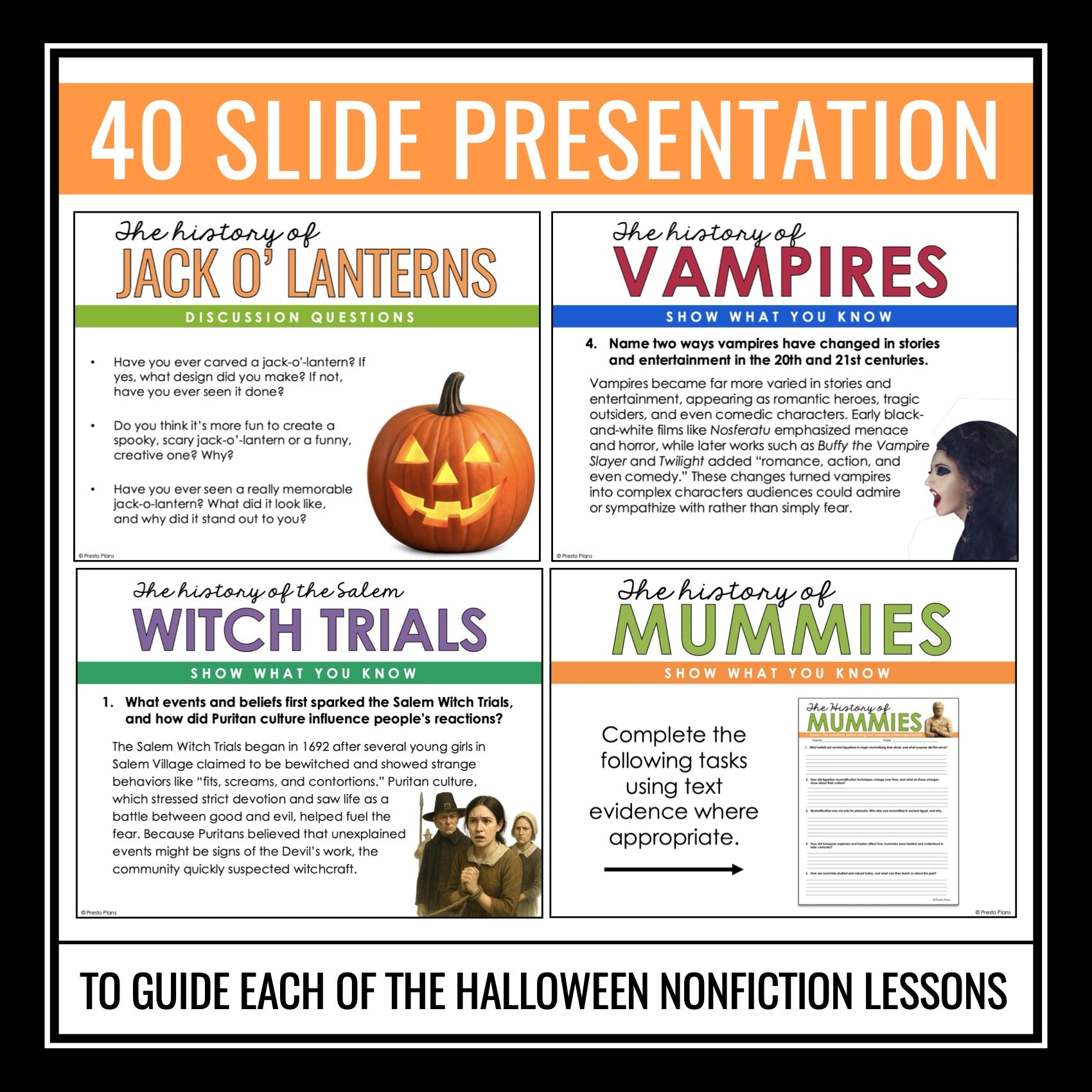 Halloween Reading Comprehension Bundle: 5 Nonfiction Articles & Assignments: Bring Halloween into your classroom while improving reading comprehension skills with this engaging Halloween nonfiction reading bundle. Perfect for October, these five articles explore the history, science, and cultural impact behind some of the most fascinating Halloween traditions and legends. Each article is paired with a comprehensive reading comprehension assignment, visually engaging presentation slides, discussion prompts, and a teacher answer key.