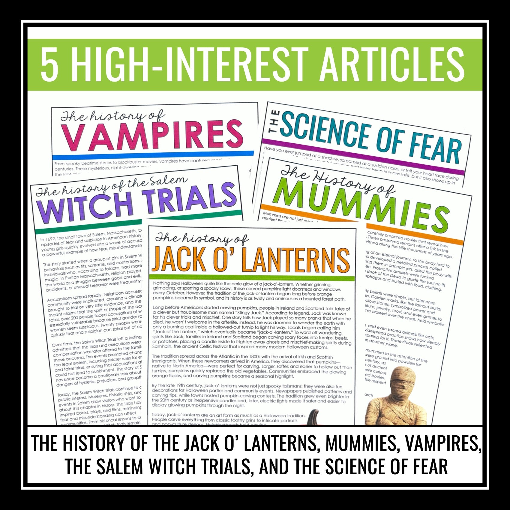 Halloween Reading Comprehension Bundle: 5 Nonfiction Articles & Assignments