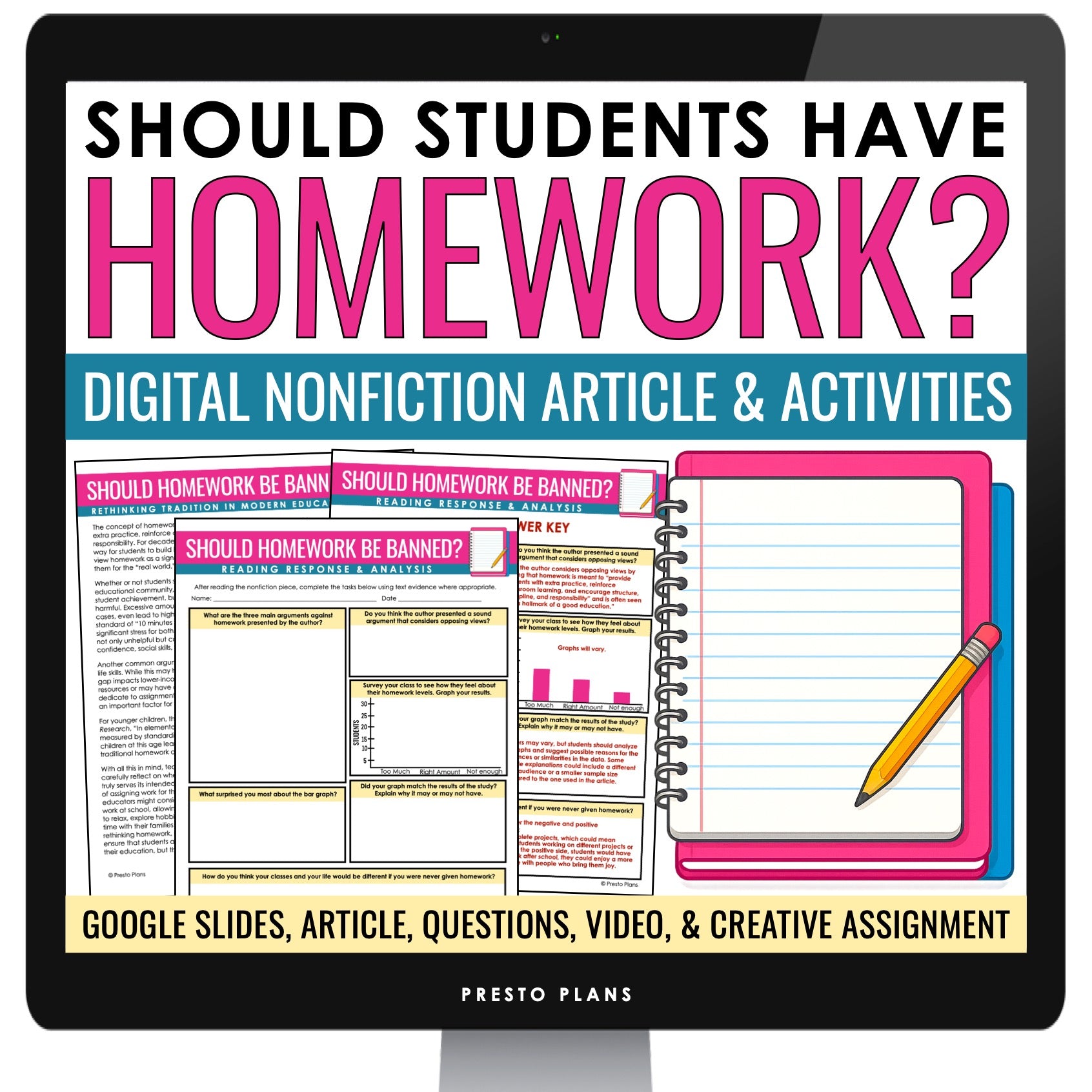 ➡️ Homework Nonfiction Article: Engage your students in an original digital nonfiction article that explores whether or not students should do homework after school hours. This informative piece provides a foundation for in-depth discussions, reading comprehension, and critical analysis.