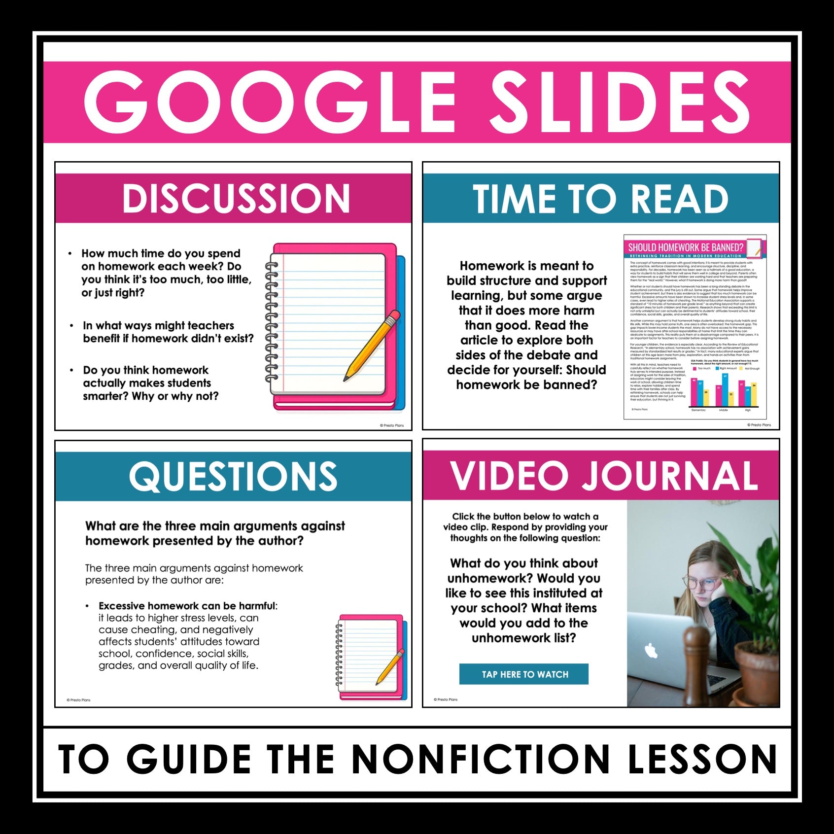Nonfiction Reading Comprehension Digital Article and Activities - Homework: Bring nonfiction into your classroom with this comprehensive digital resource, designed to meet your informational text standards. Use the included Google slides to guide this high-interest nonfiction reading comprehension lesson where students will read an article about whether or not students should do homework after school hours. Students will then show their comprehension and analysis of the article with a ready-to-use digital response assignment, focusing on main idea, evaluating arguments, text connections, and more! Also included is a fun and creative digital assignment where students write a persuasive letter to their principal to convince them to get rid of homework at their school. This nonfiction reading comprehension lesson has everything you need to help your students be stronger at reading and analyzing informational texts.