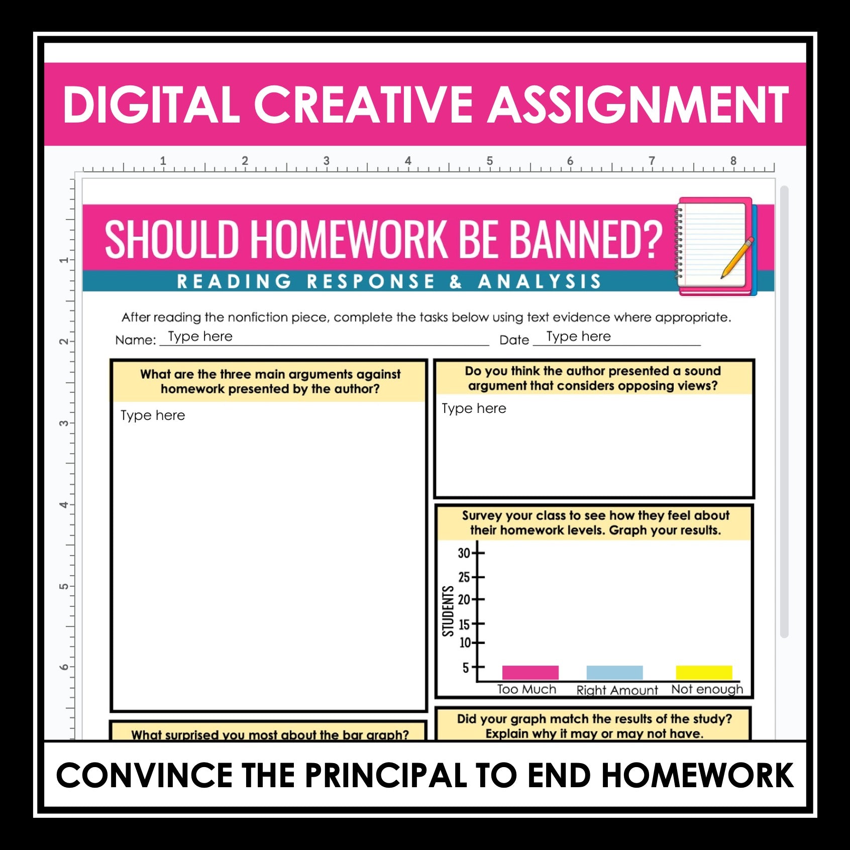 ➡️ Letter to the Principal Digital Creative Response Assignment: Foster creativity and critical thinking skills with this engaging digital assignment. Students write a persuasive letter to their principal to convince them to get rid of homework at their school. They will use what they learned in the article and outside research to make their points. A planning graphic organizer and good copy template are provided.