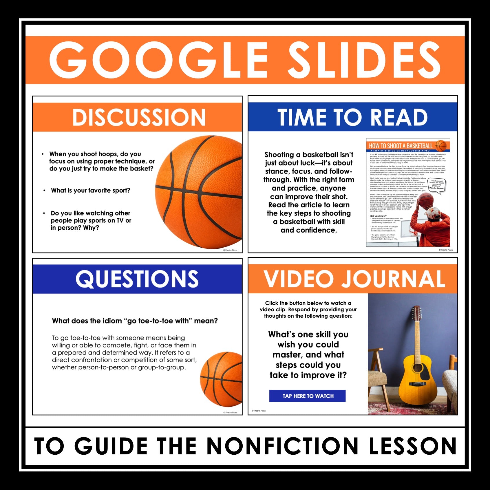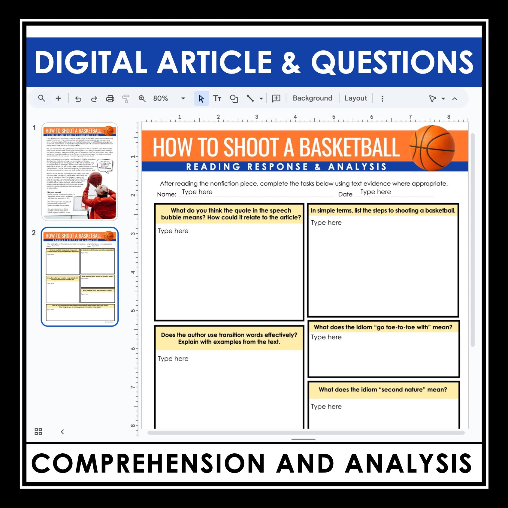 Nonfiction Reading Comprehension Digital Article and Activities - Basketball: Bring nonfiction into your classroom with this comprehensive digital resource, designed to meet your informational text standards. Use the included Google slides to guide this high-interest nonfiction reading comprehension lesson where students will read an article about how to properly shoot a basketball. Students will then show their comprehension and analysis of the article with a ready-to-use digital response assignment, focusing on evaluating text features, evaluating the author’s writing style, summarizing information, inferring information, analyzing idioms, and making reflections. Also included is a fun and creative digital assignment where students practice the process of instructional writing by writing the steps for making the perfect sandwich. This nonfiction reading comprehension basketball lesson has everything you need to help your students be stronger at reading and analyzing informational texts.