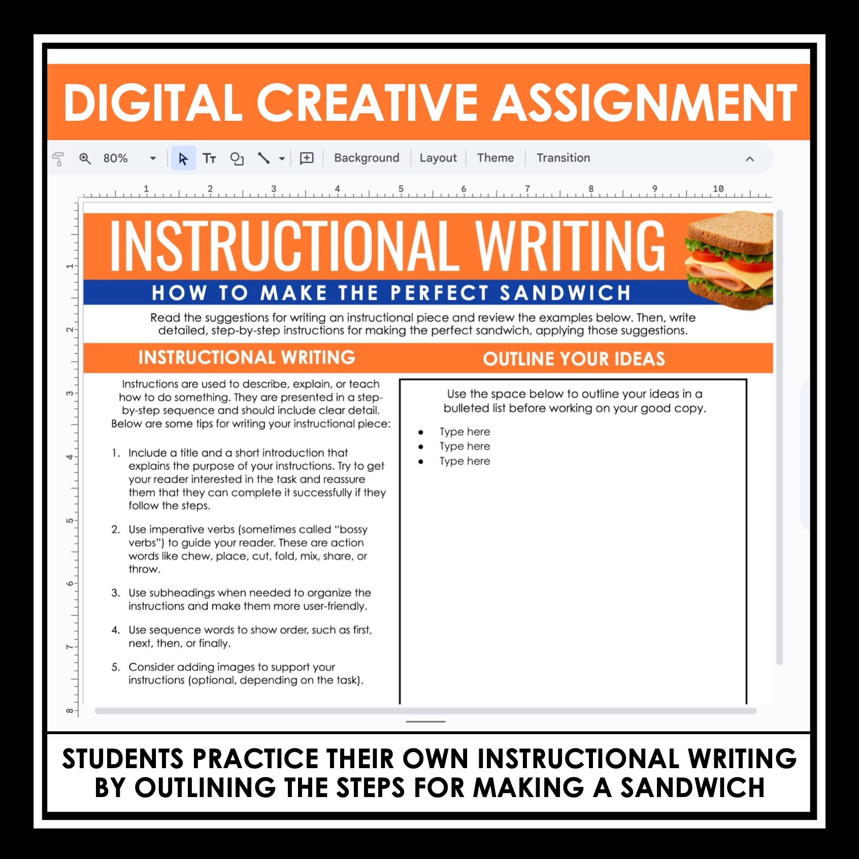 ➡️ How to Make the Perfect Sandwich Digital Creative Response Assignment (Instructional Writing): Foster creativity and critical thinking skills with this engaging digital assignment where students practice the process of instructional writing by writing the steps for making the perfect sandwich. This assignment allows students to take what they have learned from the writing style of the article and apply it to their own instructional writing.
