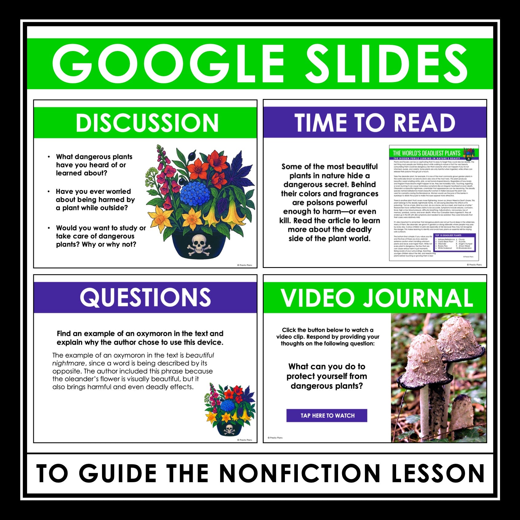 ➡️ Deadliest Plants Google Slides: Use this Google Slides presentation to guide you through every element of the lesson. From pre-reading discussion questions to activity prompts and answer keys, each slide is crafted to facilitate engaging classroom discussions. Additionally, the presentation includes a link to a related video and a video writing prompt, enabling students to make meaningful text-to-self connections.