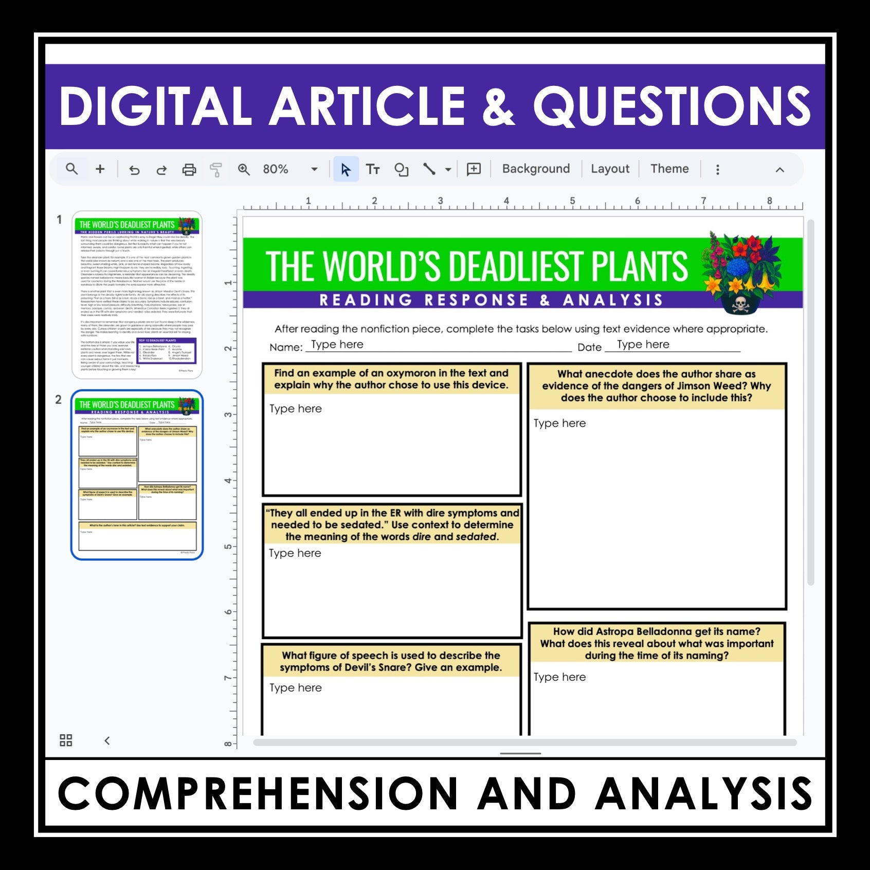Nonfiction Reading Comprehension Digital Article & Activities Deadliest Planets: Bring nonfiction into your classroom with this comprehensive digital resource, designed to meet your informational text standards. Use the included Google slides to guide this high-interest nonfiction reading comprehension lesson where students will read an article about the deadliest plants in the world. Students will then show their comprehension and analysis of the article with a ready-to-use digital response assignment, focusing on finding text evidence, analyzing figurative language, using context to determine the meaning of vocabulary, examining author’s tone, analyzing anecdotes, and making inferences. Also included is a fun and creative digital assignment where students must research three poisonous plants and plant a poison garden. This nonfiction reading comprehension lesson has everything you need to help your students be stronger at reading and analyzing informational texts.