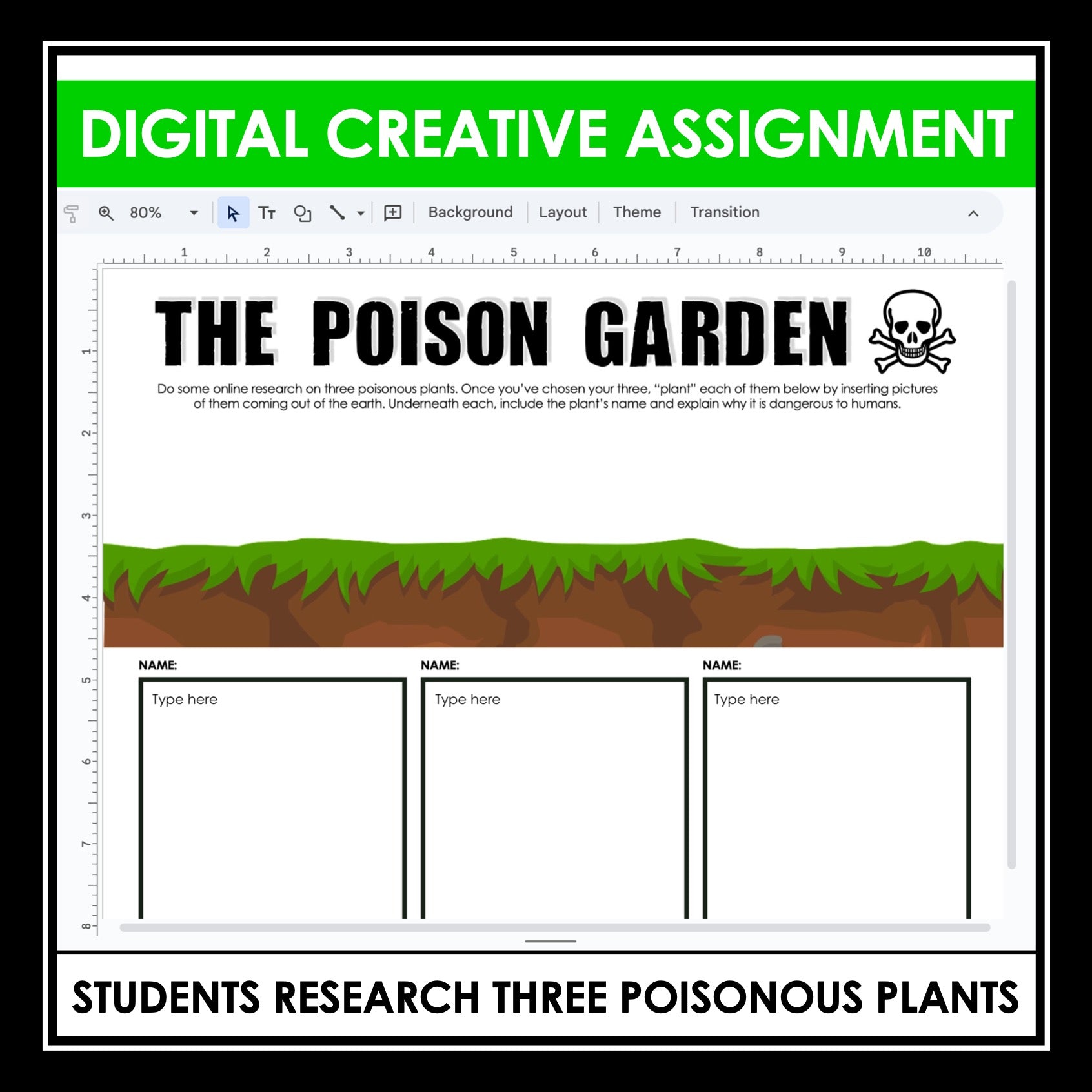 ➡️ The Poison Garden Digital Creative Response Assignment: Foster creativity and critical thinking skills with this engaging digital assignment where students must research three poisonous plants and plant a poison garden. They will “plant” three poisonous plants by drawing them on the template. Underneath each, students will share what the plants are called and why they are dangerous to humans.