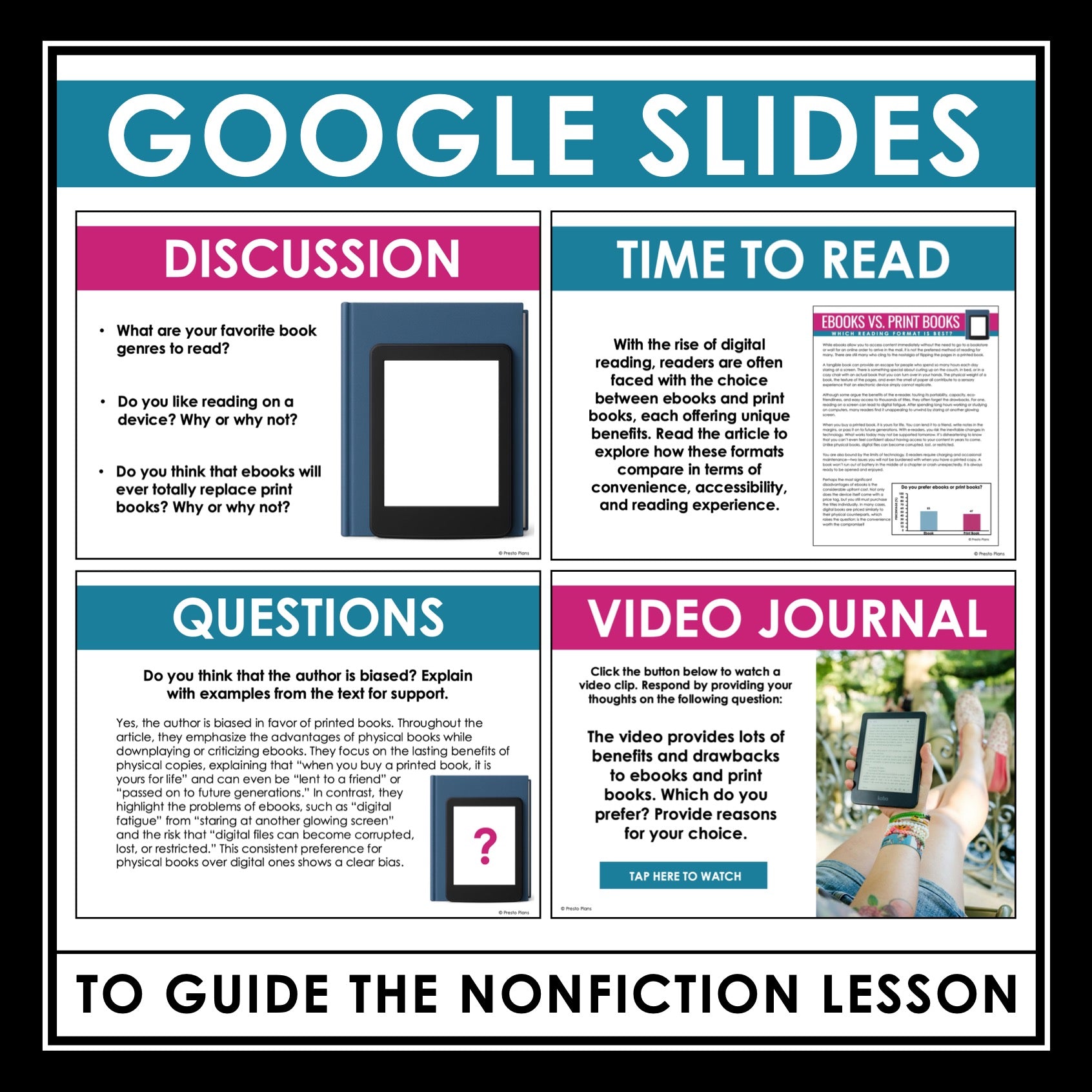 ➡️ Ebooks vs. Print Books Google Slides: Use this Google Slides presentation to guide you through every element of the lesson. From pre-reading discussion questions to activity prompts and answer keys, each slide is crafted to facilitate engaging classroom discussions. Additionally, the presentation includes a link to a related video and a video writing prompt, enabling students to make meaningful text-to-self connections.