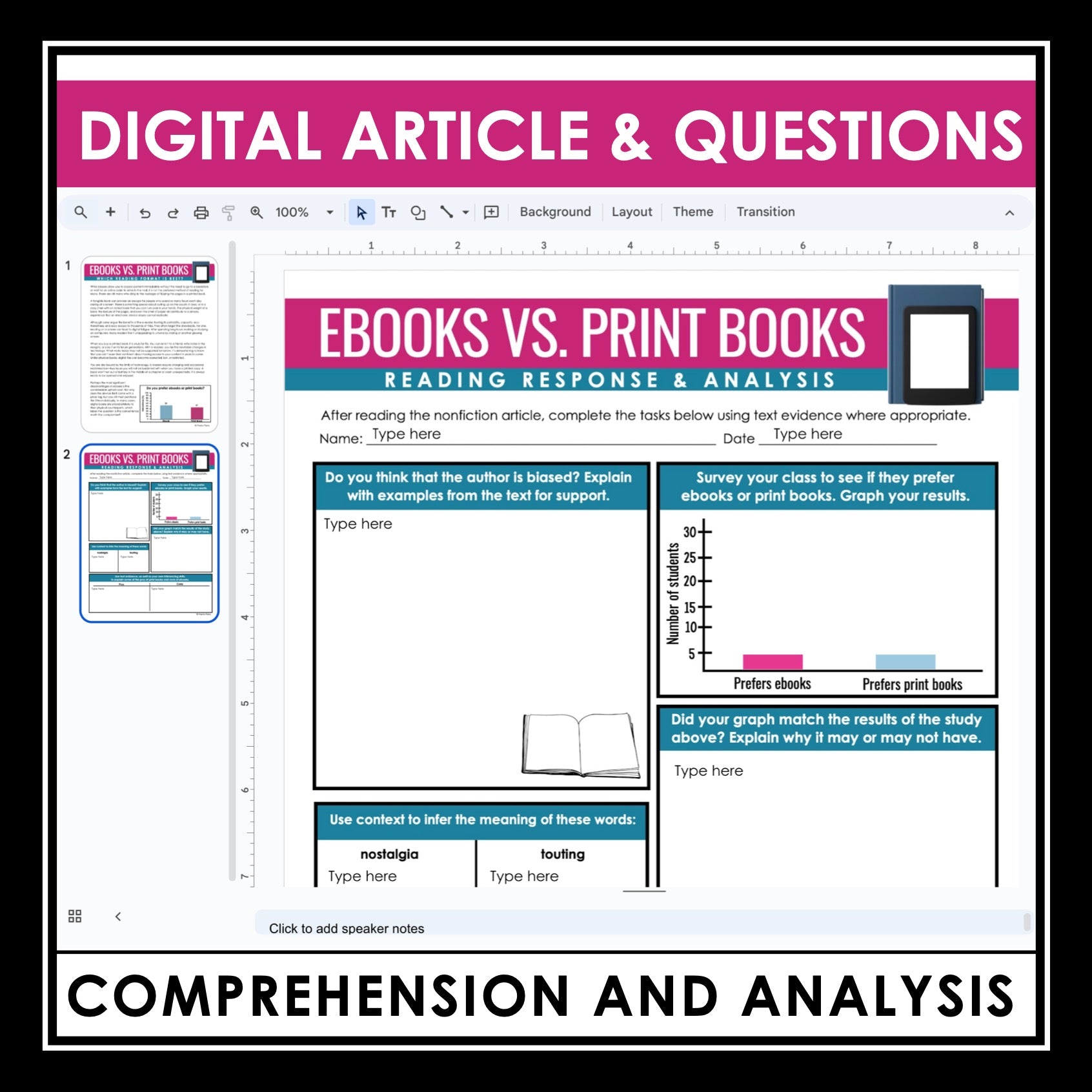 Nonfiction Reading Comprehension Digital Activities - Ebooks vs. Print Books: Bring nonfiction into your classroom with this comprehensive digital resource, designed to meet your informational text standards. Use the included Google slides to guide this high-interest nonfiction reading comprehension and analysis lesson where students will read an article about the enduring debate of which is better: print books or ebooks. Students will then show their comprehension and analysis of the article with a ready-to-use digital response assignment, focusing on evaluating the author, making connections, finding text evidence and making inferences. Also included is a fun and creative digital assignment where students take on the role of an author who must plan and write a book blurb to entice readers to pick up their new book. This ebook vs print book nonfiction reading comprehension and analysis lesson has everything you need to help your students be stronger at reading and analyzing informational texts.