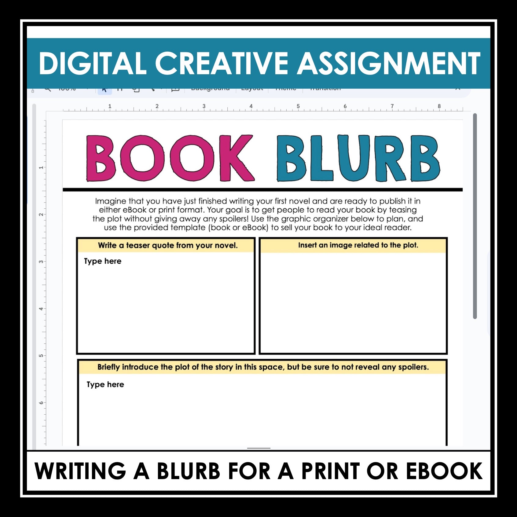 ➡️ Book Blurb Digital Creative Response Assignment: Foster creativity and critical thinking skills with this engaging digital assignment. Students take on the role of a new author who is tasked with crafting a compelling blurb for either an ebook or print book.