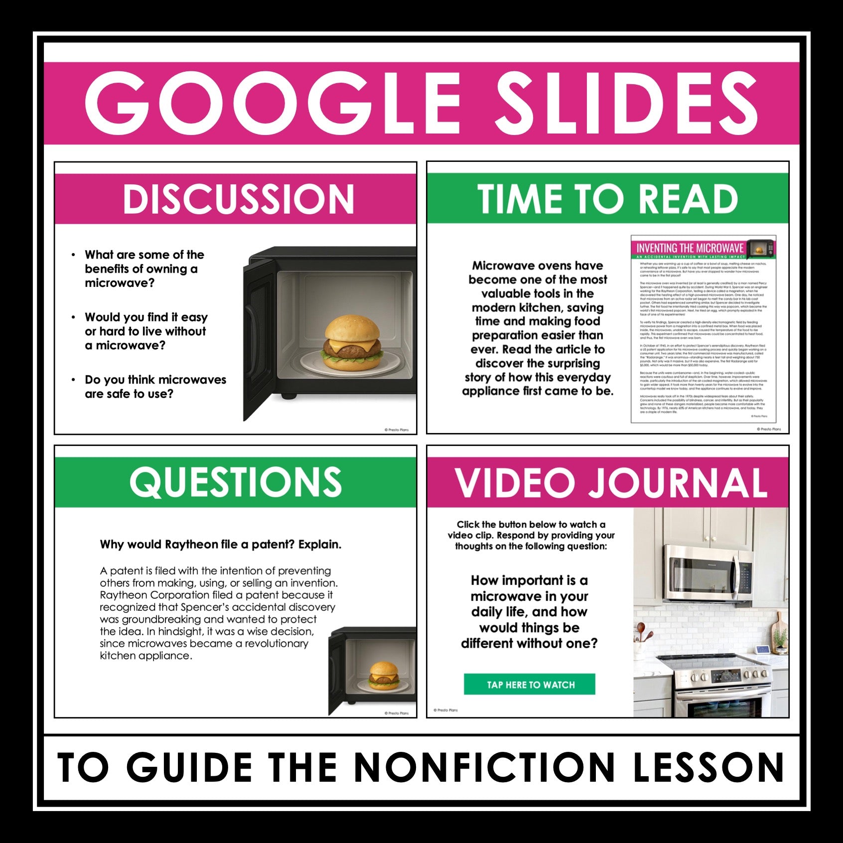 ➡️ Inventing The Microwave Google Slides: Use this Google Slides presentation to guide you through every element of the lesson. From pre-reading discussion questions to activity prompts and answer keys, each slide is crafted to facilitate engaging classroom discussions. Additionally, the presentation includes a link to a related video and a video writing prompt, enabling students to make meaningful text-to-self connections.