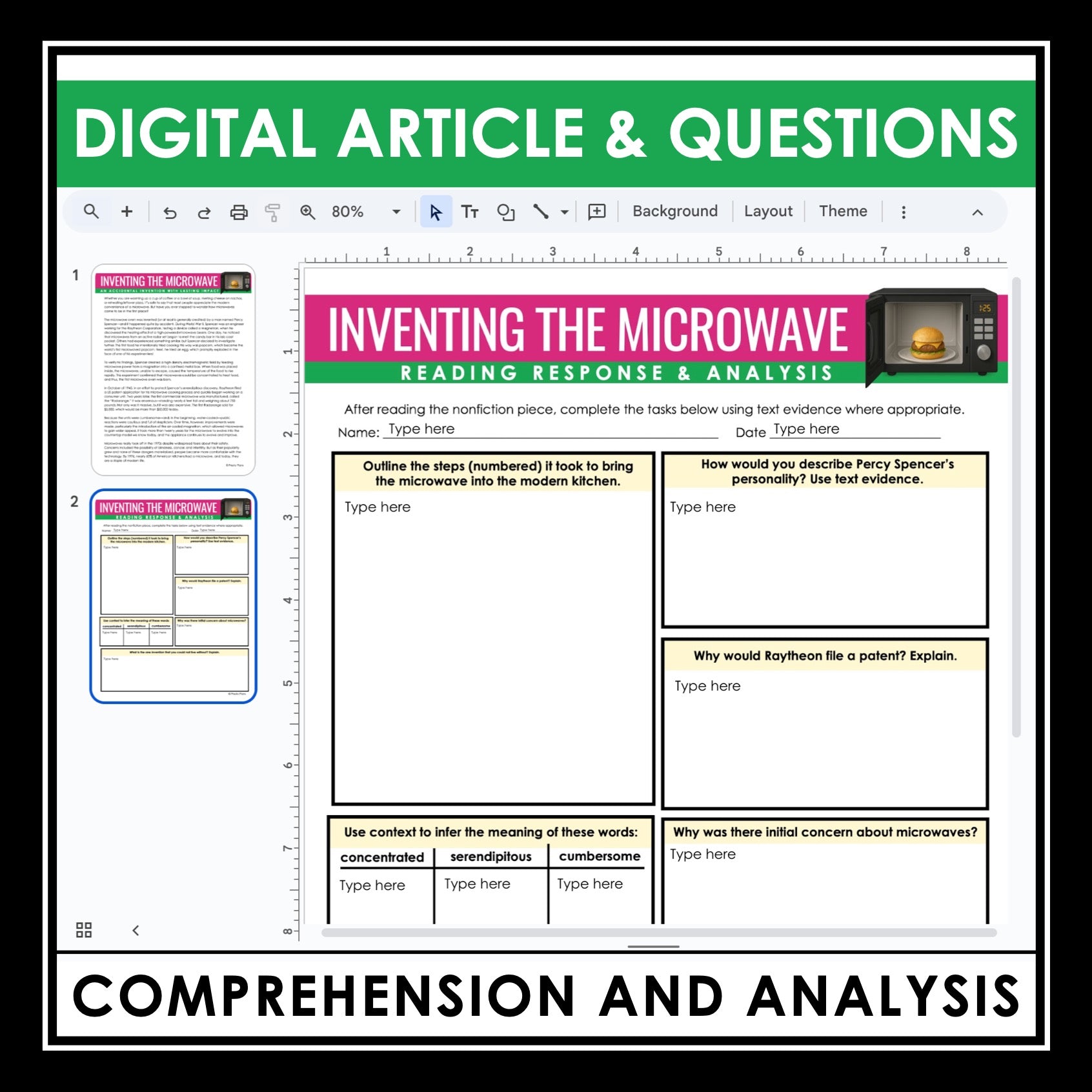 Nonfiction Reading Comprehension Digital Activities - Microwave Invention: Bring nonfiction into your classroom with this comprehensive digital resource, designed to meet your informational text standards. Use the included Google slides to guide this high-interest nonfiction reading comprehension lesson where students will read an article about the accidental invention of the microwave. Students will then show their comprehension and analysis of the article with a ready-to-use digital response assignment, focusing on finding text evidence, making connections, using context to determine the meaning of new vocabulary words, and making inferences and judgements. Also included is a fun and creative digital assignment where students must invent an upgraded microwave with amazing features. This nonfiction reading comprehension lesson has everything you need to help your students be stronger at reading and analyzing informational texts.