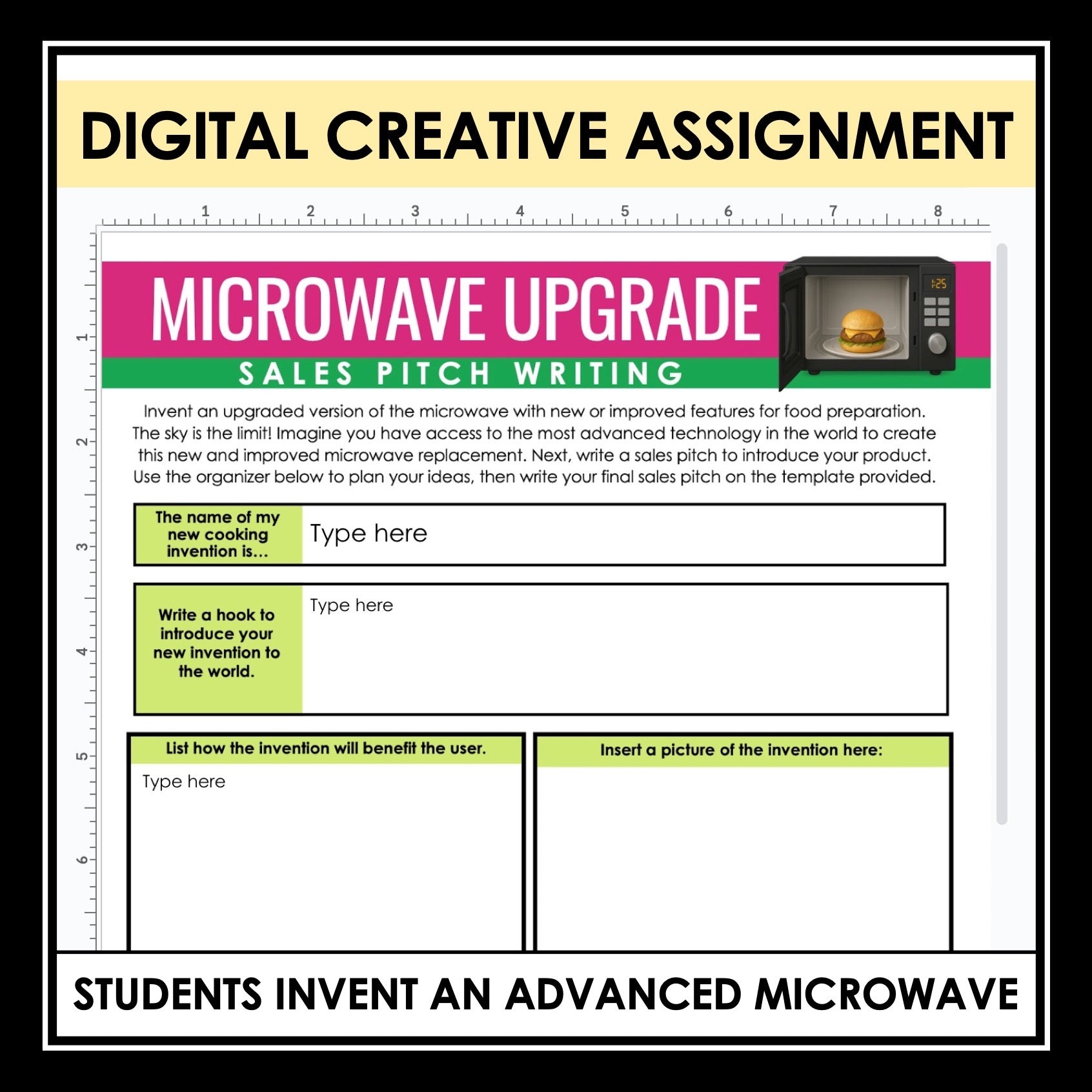 ➡️ Selling Your Microwave Upgrade Digital Creative Response Assignment: Foster creativity and critical thinking skills with this engaging digital assignment where students must invent an upgraded microwave with amazing features. The sky is the limit! Students will imagine they have the most advanced technology in the world for the new and improved microwave replacement. They will write a sales pitch to introduce your new product using the included graphic organizer and good copy page.