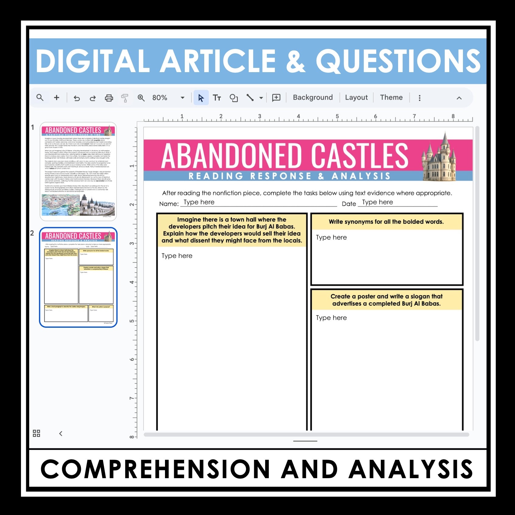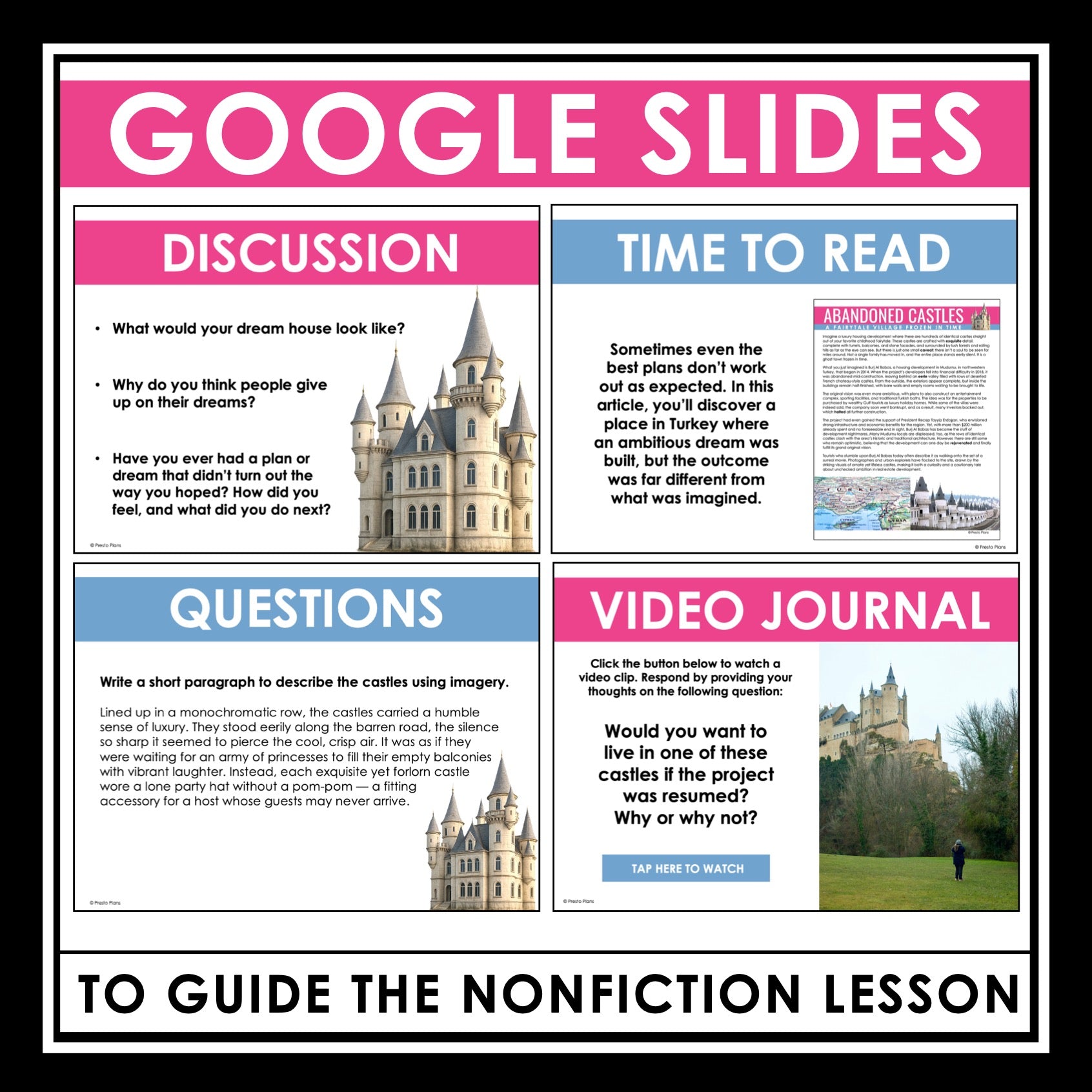 Nonfiction Reading Comprehension Digital Article & Activities Abandoned Castles: Bring nonfiction into your classroom with this comprehensive digital resource, designed to meet your informational text standards. Use the included Google slides to guide this high-interest nonfiction reading comprehension lesson where students will read an article about a town of abandoned castles that were built in Turkey. Students will then show their comprehension and analysis of the article with a ready-to-use digital response assignment, focusing on critical thinking, author’s purpose, vocabulary and synonyms, imagery, creative response, and more. Also included is a fun and creative digital assignment where students imagine they win the lottery and have the chance to design their dream home. This abandoned castles nonfiction reading comprehension lesson has everything you need to help your students be stronger at reading and analyzing informational texts.