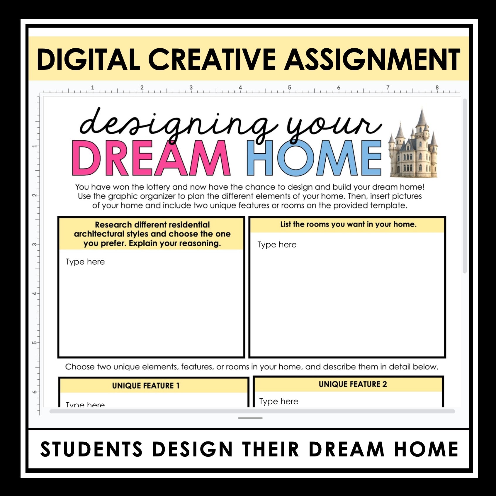 ➡️ Designing your Dream Home Digital Creative Response Assignment: Foster creativity and critical thinking skills with this engaging digital assignment. Students imagine they win the lottery and have the chance to design their dream home. They will consider the architectural style, rooms, unique features, and more using the included graphic organizer. A template is also included for them to draw the exterior and two unique features.
