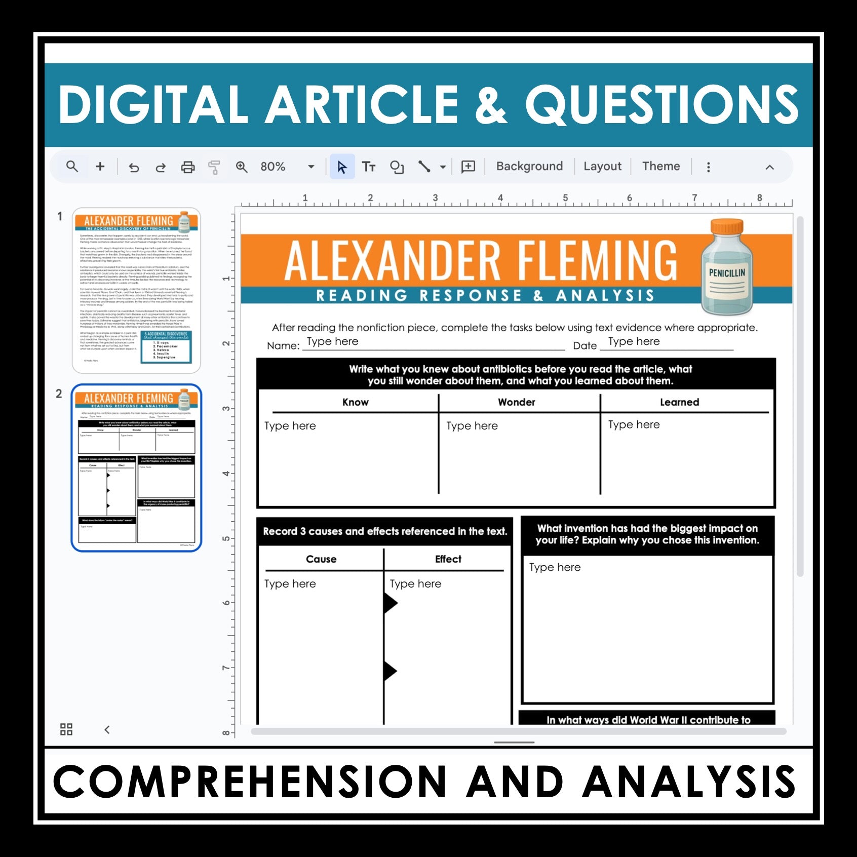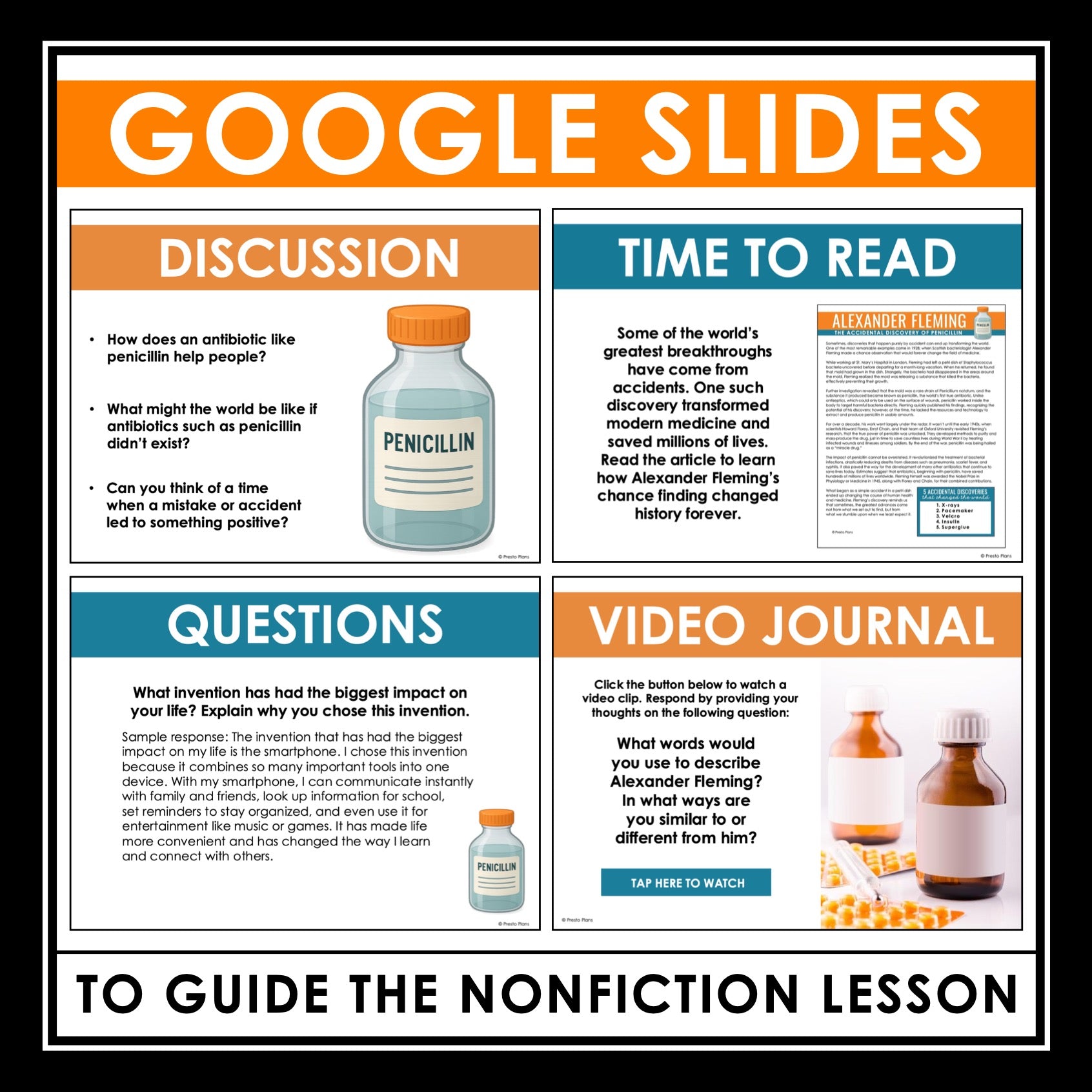 Nonfiction Reading Comprehension Digital Activities - Penicillin Discovery: Bring nonfiction into your classroom with this comprehensive digital resource, designed to meet your informational text standards. Use the included Google slides to guide this high-interest nonfiction reading comprehension lesson where students will read an article about Alexander Fleming, a scientist who accidentally founded the antibiotic penicillin. Students will then show their comprehension and analysis of the article with a ready-to-use digital response assignment, focusing on finding text evidence, analyzing cause and effect, using context to infer the meaning of idioms, making text connections, and evaluating the author’s writing. Also included is a fun and creative digital assignment where students must research and create a timeline for another accidental scientific discovery. This nonfiction reading comprehension lesson has everything you need to help your students be stronger at reading and analyzing informational texts.