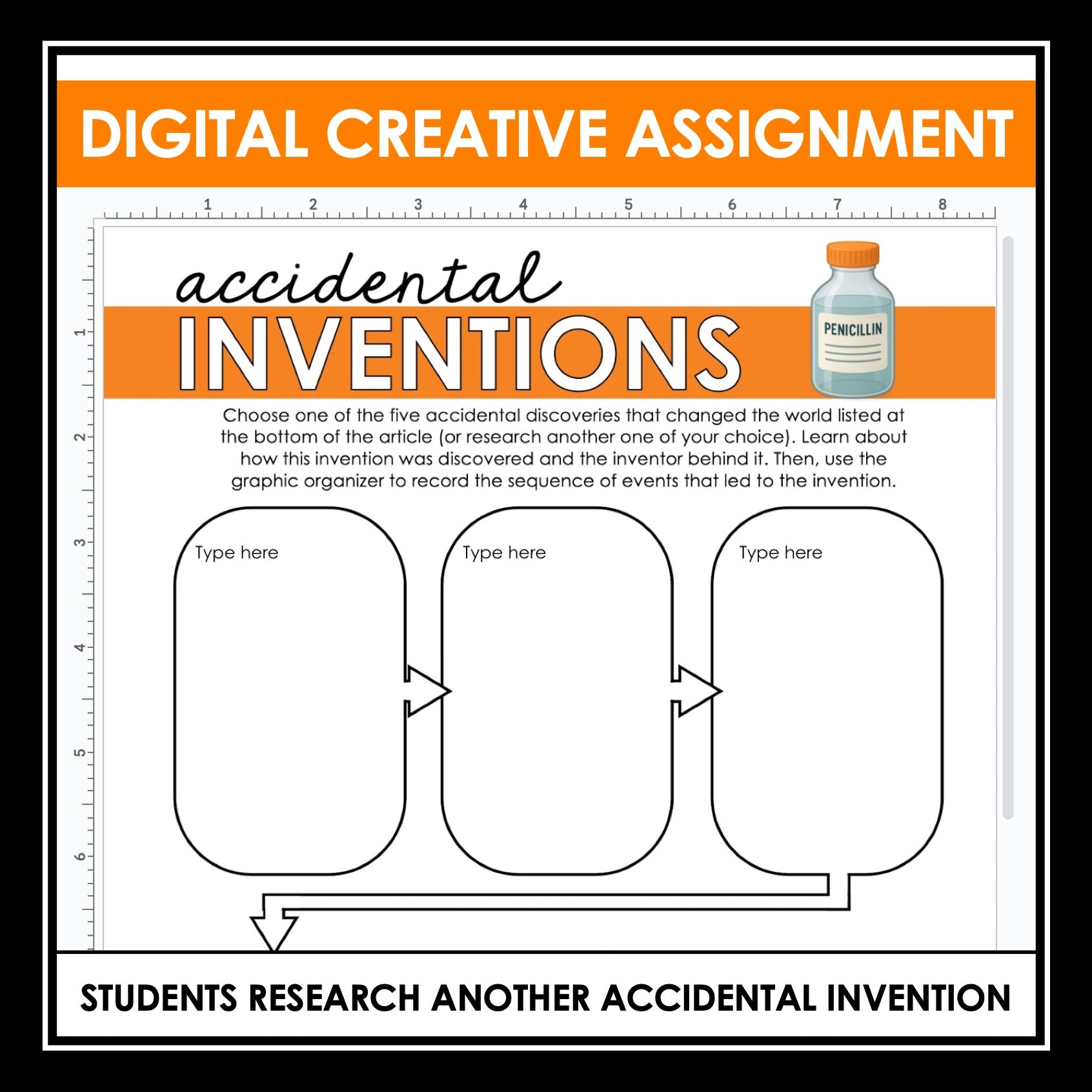➡️ Accidental Inventions Digital Creative Response Assignment: Foster creativity and critical thinking skills with this engaging digital assignment where students must research and create a timeline for another accidental scientific discovery. They will choose from 5 different accidental inventions and research to learn about how this invention came to be and the inventor behind the story. Students will complete a graphic organizer with the sequence of events that led to the invention coming to be.