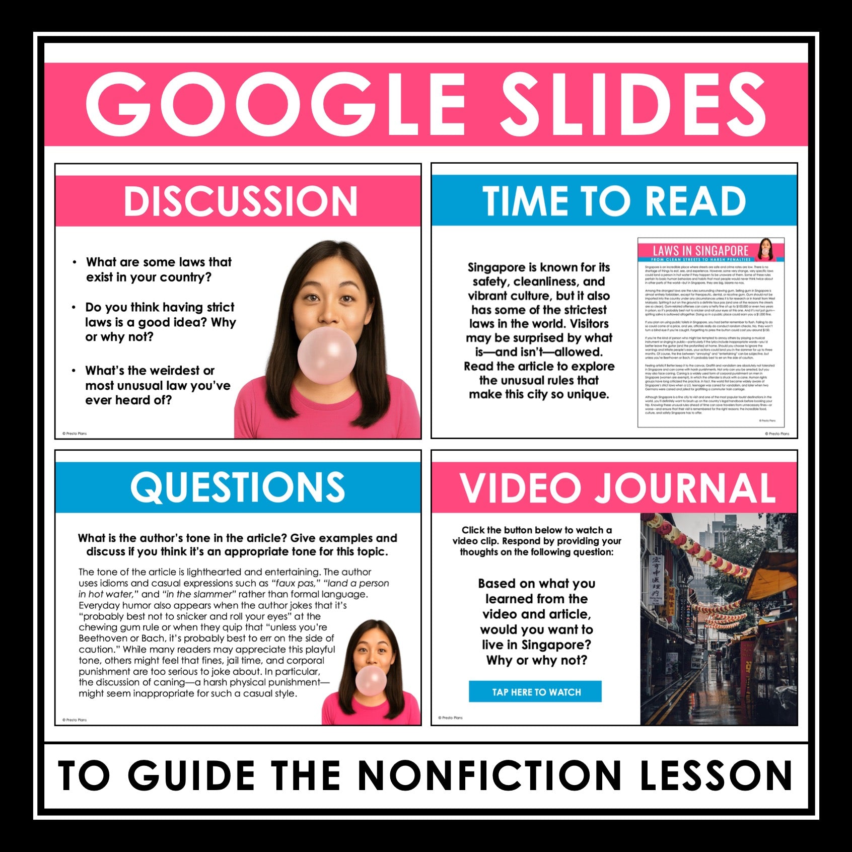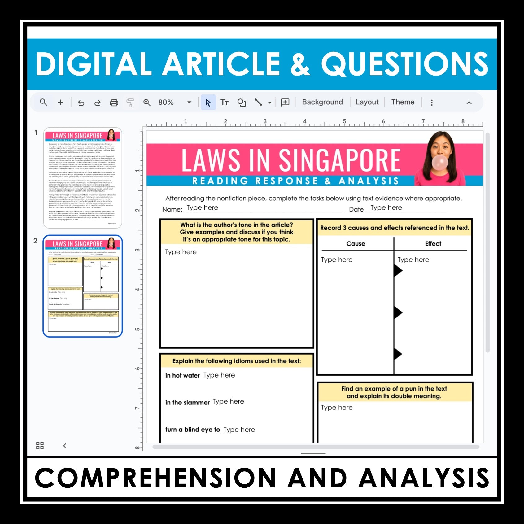 Nonfiction Reading Comprehension Digital Article and Activities - Singapore Laws: Bring nonfiction into your classroom with this comprehensive digital resource, designed to meet your informational text standards. Use the included Google slides to guide this high-interest nonfiction reading comprehension lesson where students will read an article about the unique laws of Singapore. Students will then show their comprehension and analysis of the article with a ready-to-use digital response assignment, focusing on finding text evidence, evaluating author’s tone, using context to infer the meaning of idioms, analyzing cause and effect, analyzing figurative language, and making and supporting claims. Also included is a fun and creative digital assignment where students must create a Singapore police report for their kidnapped principal. This nonfiction reading comprehension lesson has everything you need to help your students be stronger at reading and analyzing informational texts.
