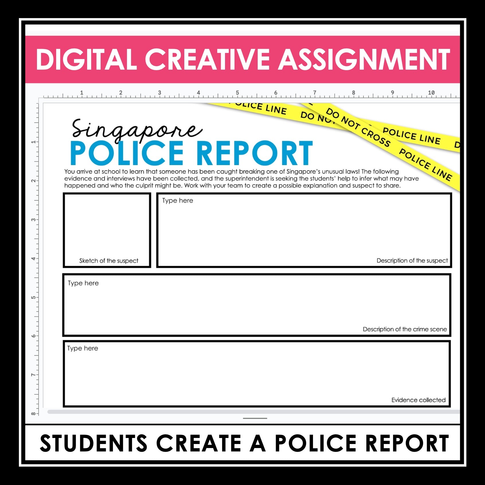 ➡️ Singapore Police Report Digital Creative Response Assignment: Foster creativity and critical thinking skills with this engaging digital assignment where students must create a Singapore police report for their kidnapped principal. They will draw a sketch of their principal and write a description of their physical appearance, the crime scene, evidence, witness testimony, interrogation, and findings.