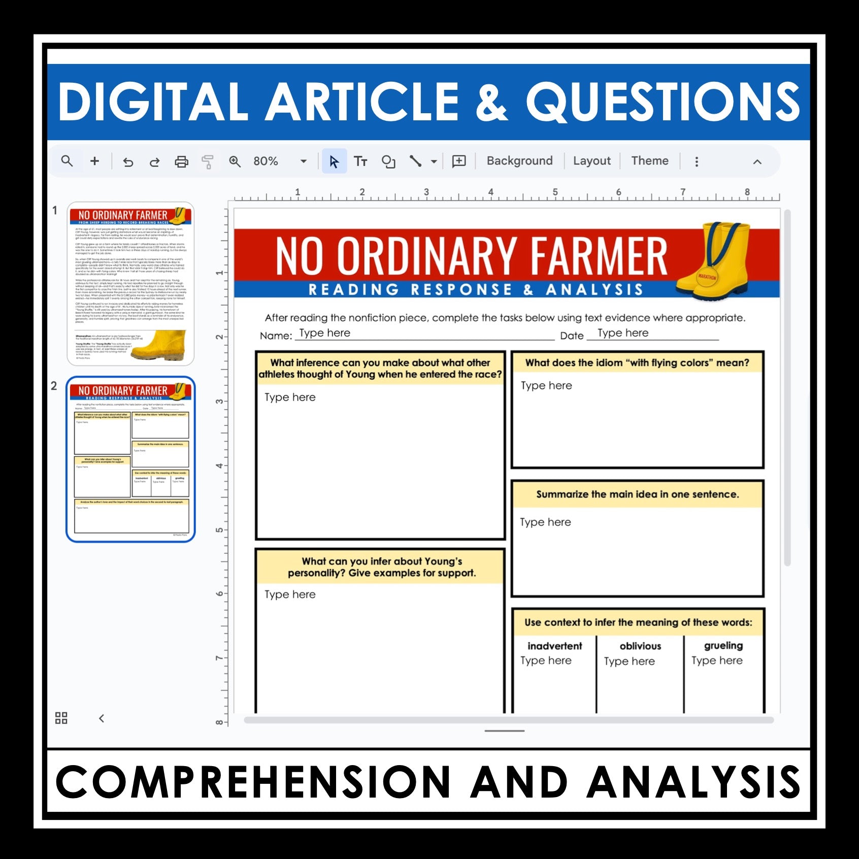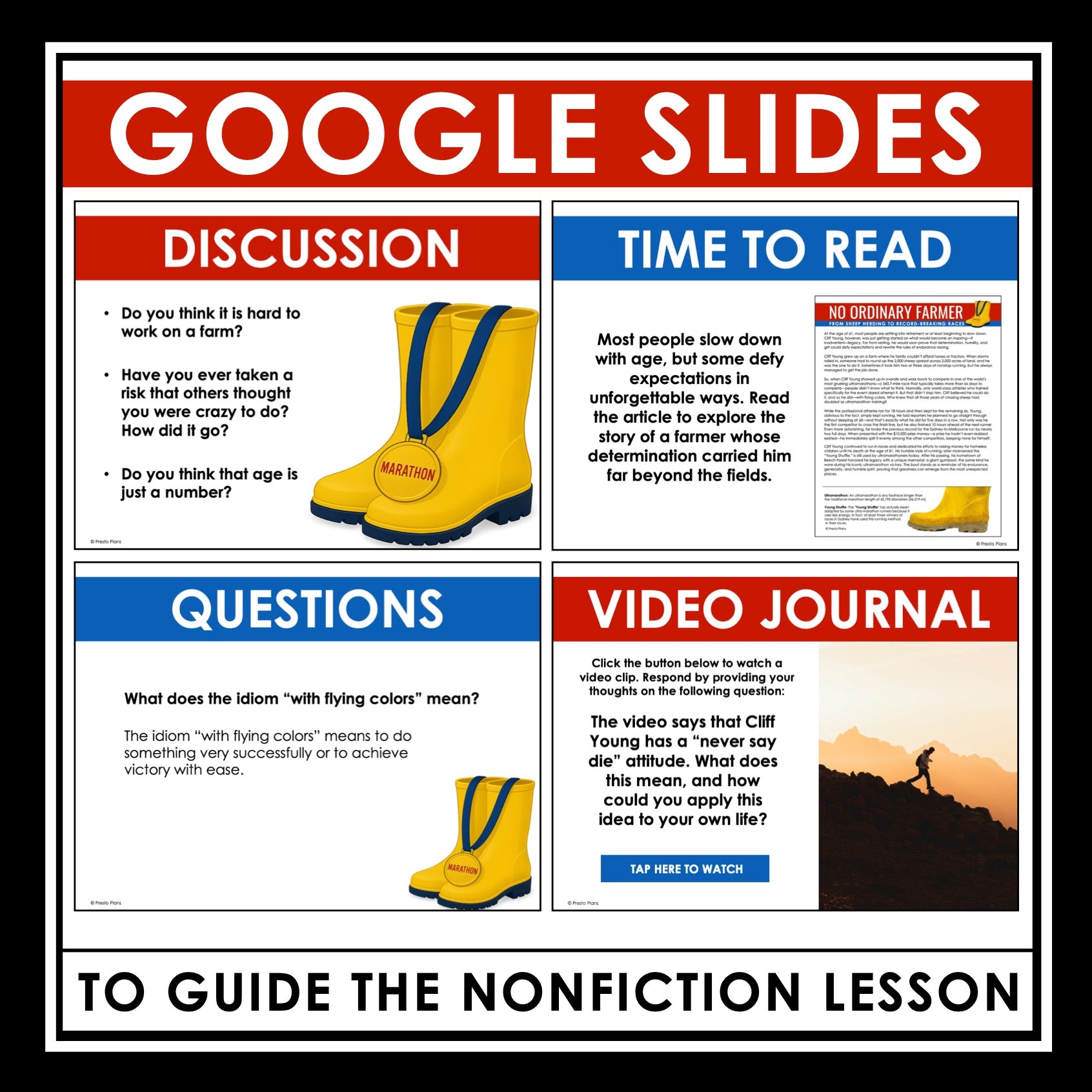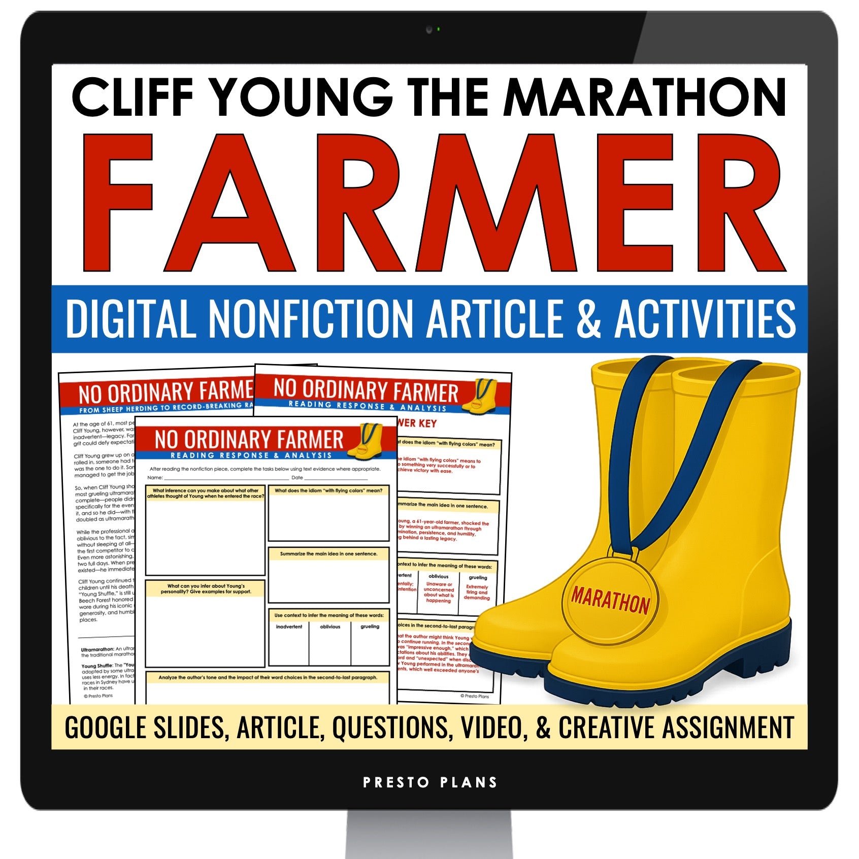 Nonfiction Reading Comprehension Digital Article & Activities Cliff Young Farmer: Bring nonfiction into your classroom with this comprehensive digital resource, designed to meet your informational text standards. Use the included Google slides to guide this high-interest nonfiction reading comprehension lesson where students will read an article about Cliff Young, an Australian potato farmer who gained fame for winning the inaugural Sydney to Melbourne Ultramarathon in 1983 at the age of 61, with no preparation using an unconventional shuffling running style. Students will then show their comprehension and analysis of the article with a ready-to-use digital response assignment, focusing on making inferences, analyzing author’s tone, evaluating word choice, understanding idioms, summarizing the main idea, and using context to determine vocabulary meaning. Also included is a fun and creative digital interview assignment where students imagine they have the opportunity to interview Cliff Young. This nonfiction reading comprehension lesson has everything you need to help your students be stronger at reading and analyzing informational texts.