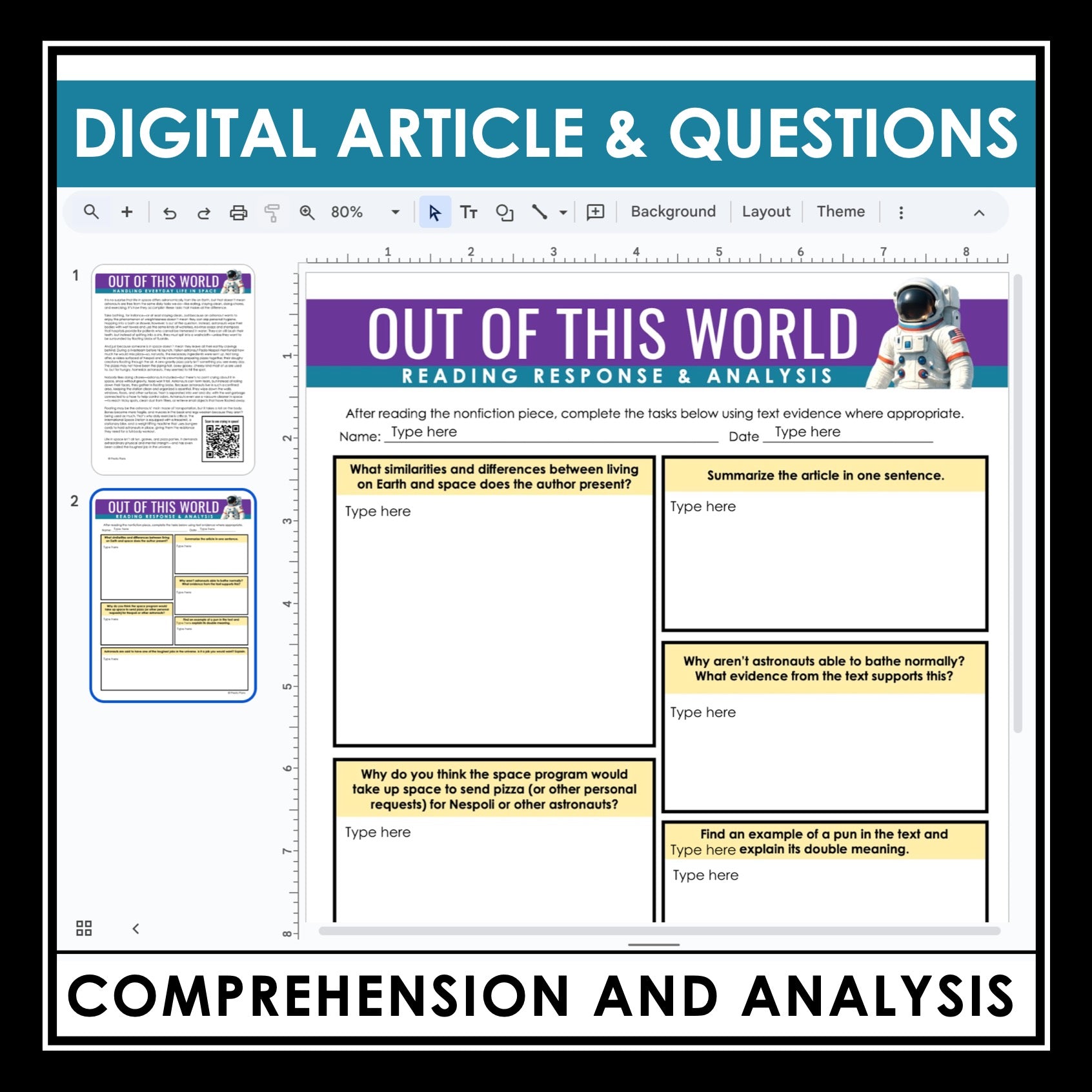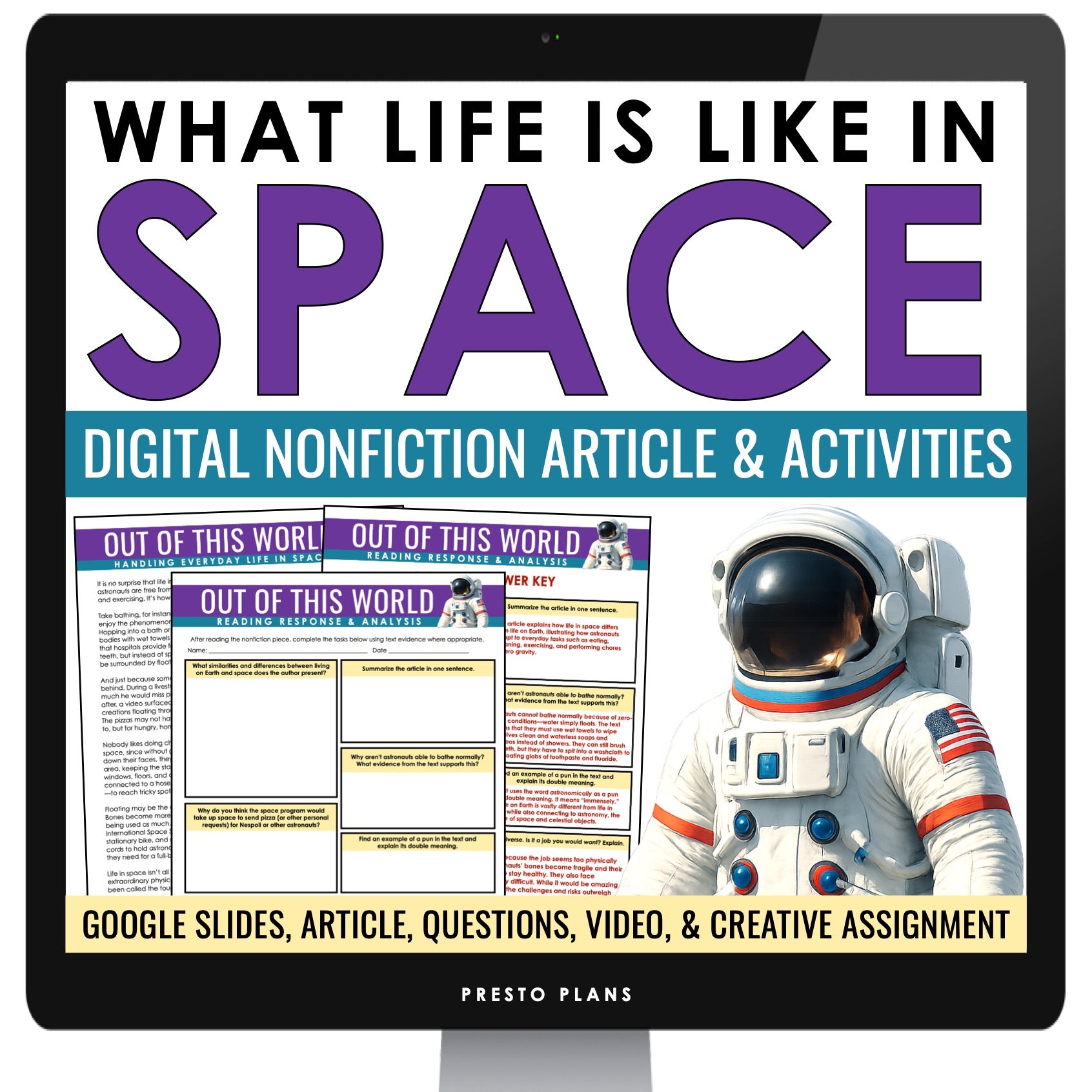 Nonfiction Reading Comprehension Digital Article and Activities - Life in Space: Bring nonfiction into your classroom with this comprehensive digital resource, designed to meet your informational text standards. Use the included Google slides to guide this high-interest nonfiction reading comprehension lesson where students will read an article about what life is like for astronauts in space. Students will then show their comprehension and analysis of the article with a ready-to-use digital response assignment, focusing on finding text evidence, comparing and contrasting information, making inferences, summarizing information, analyzing figurative language, and making connections. Also included is a fun and creative digital assignment where students must write a daily schedule as an astronaut living in space. This nonfiction reading comprehension lesson has everything you need to help your students be stronger at reading and analyzing informational texts.