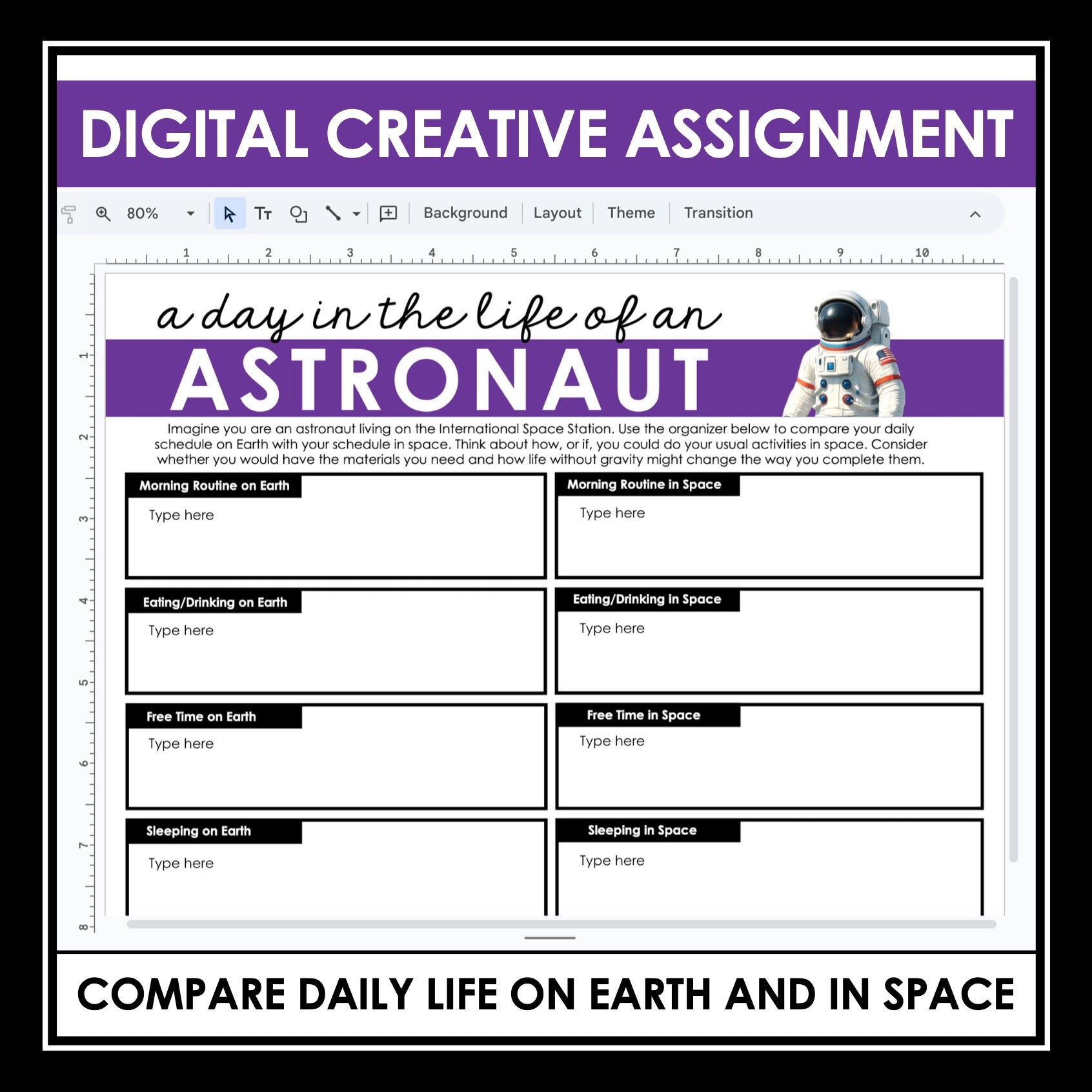 ➡️ A Day in the Life of an Astronaut Digital Creative Response Assignment: Foster creativity and critical thinking skills with this engaging digital assignment where students must write a daily schedule as an astronaut living in space. They will imagine that they are astronauts living at the International Space Station. Students will use the organizer to compare their current daily schedule on Earth to their schedule in space by theorizing how they might do their regular tasks in space without gravity.