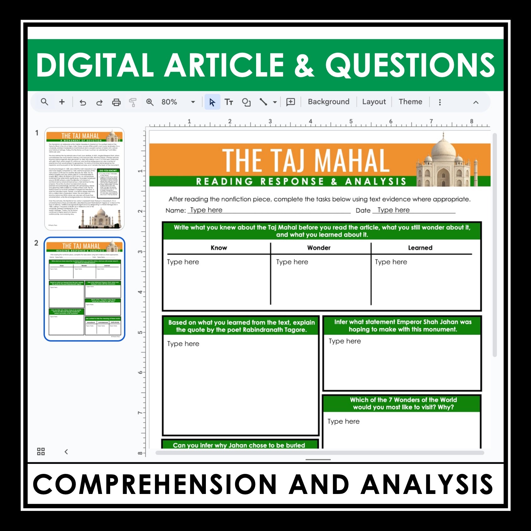 Nonfiction Reading Comprehension Digital Article and Activities - The Taj Mahal