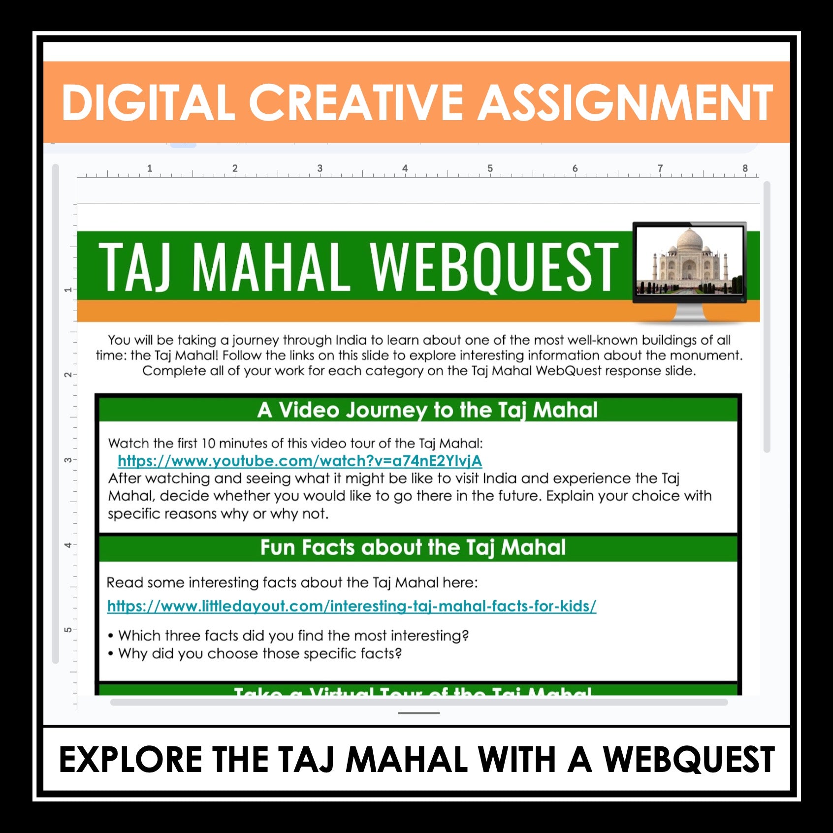 ➡️ The Taj Mahal WebQuest Digital Creative Response Assignment: Foster creativity and critical thinking skills with this engaging digital assignment where students go on an online WebQuest to learn even more about the Taj Mahal. They will take a tour of the building, learn fun facts, and gain more information on Shah Jahan.