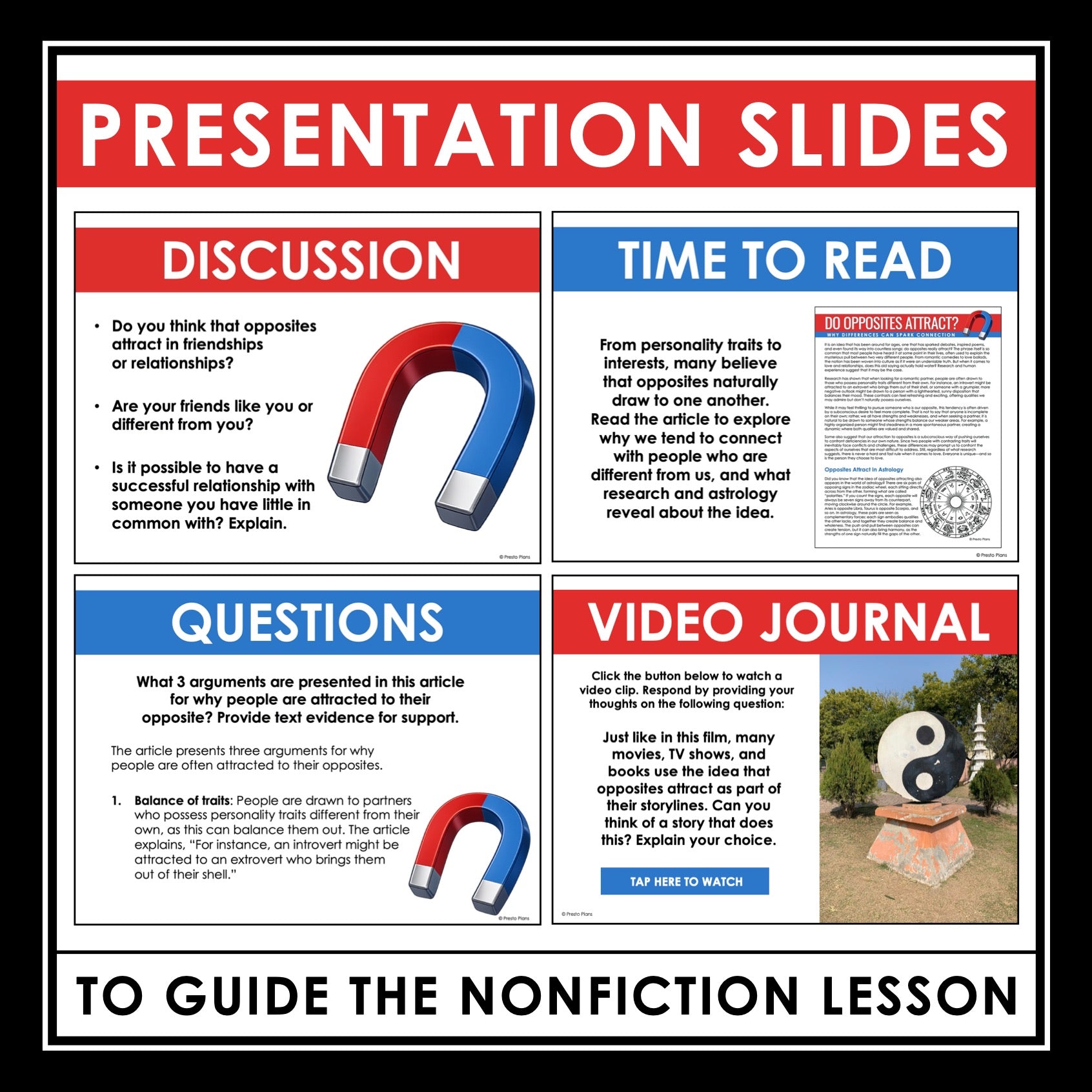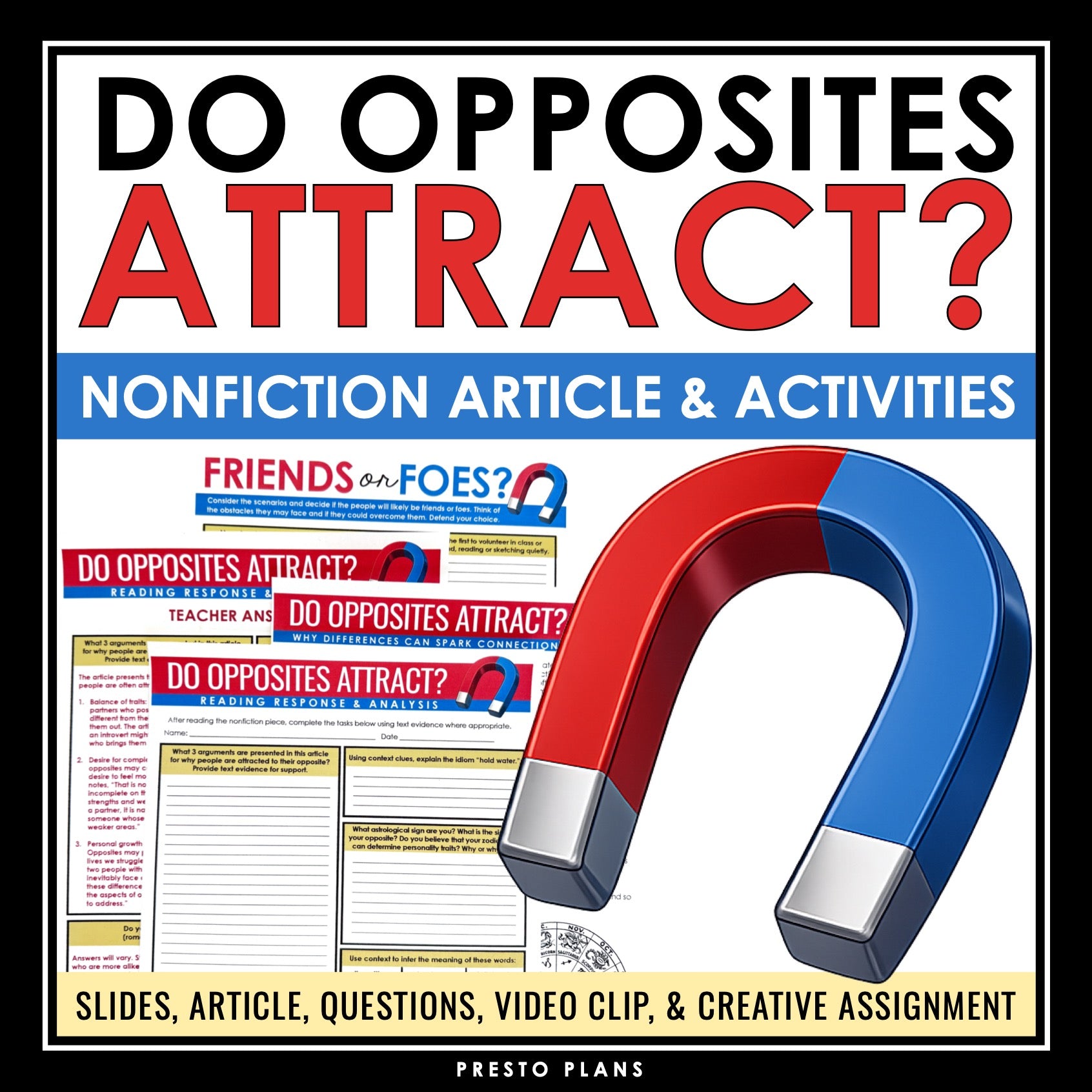 Nonfiction Reading Comprehension Article and Activities - Do Opposites Attract?: Bring nonfiction into your classroom with this comprehensive resource, designed to meet your informational text standards. Use the included presentation slides to guide this high-interest nonfiction reading comprehension lesson where students will read an article about whether or not opposites attract in a relationship. Students will then show their comprehension and analysis of the article with a ready-to-use response assignment, focusing on locating arguments, finding text evidence, using context clues to understand idioms and vocabulary, making connections, inferring information, and more. Also included is a fun and creative friends or foes assignment where students read scenarios of couples and decide if the people in it would be a good match. This nonfiction reading comprehension lesson has everything you need to help your students be stronger at reading and analyzing informational texts.