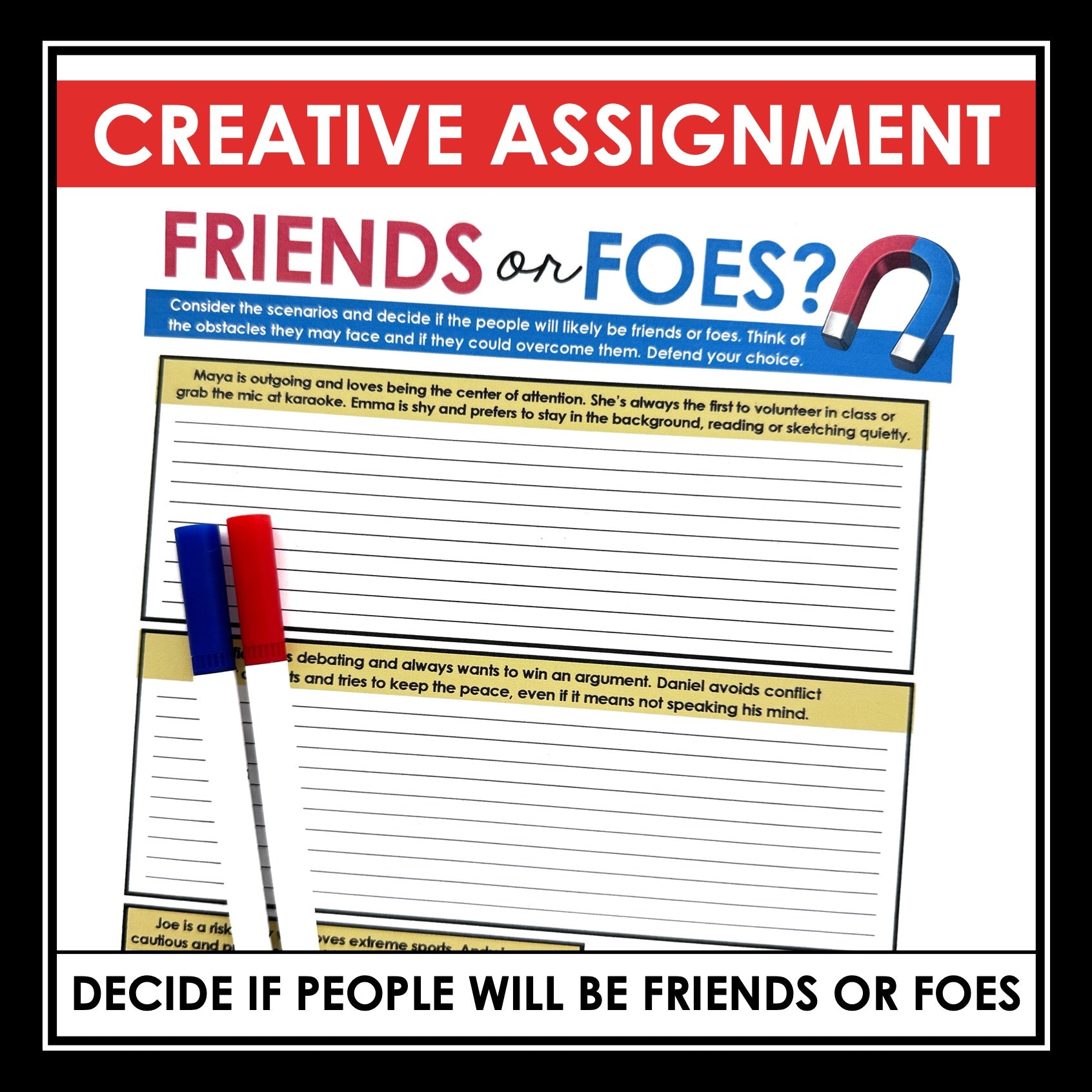 ➡️ Friends or Foes Creative Response Assignment: Foster creativity and critical thinking skills with this engaging assignment. Students read scenarios of couples and decide if the people in it would be a good match. They will consider the obstacles that each of the three couples might face and decide if they are better off as friends or foes.