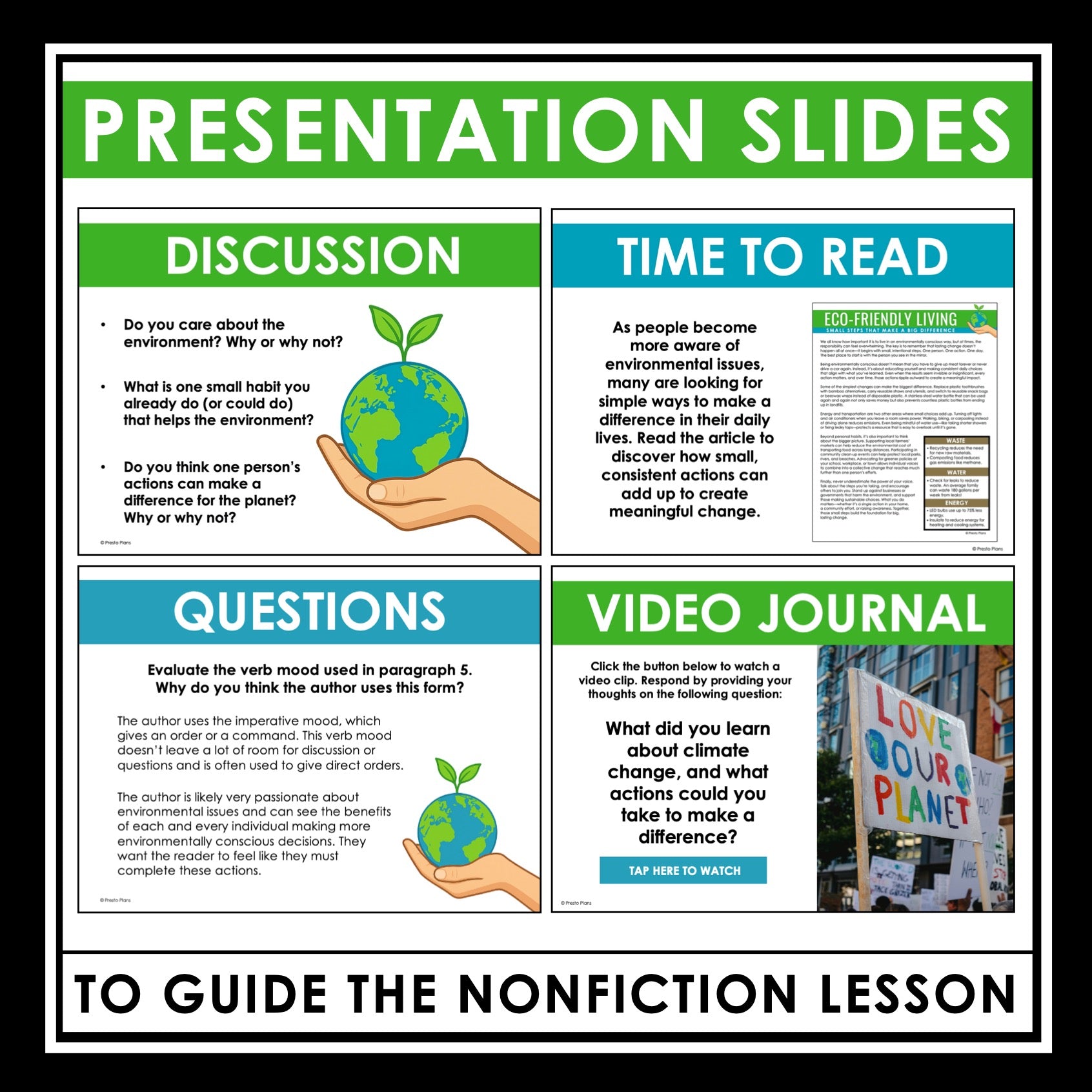 ➡️ Eco-Friendly Living Presentation Slides: Use this PowerPoint presentation to guide you through every element of the lesson. From pre-reading discussion questions to activity prompts and answer keys, each slide is crafted to facilitate engaging classroom discussions. Additionally, the presentation includes a link to a related video and a video writing prompt, enabling students to make meaningful text-to-self connections.