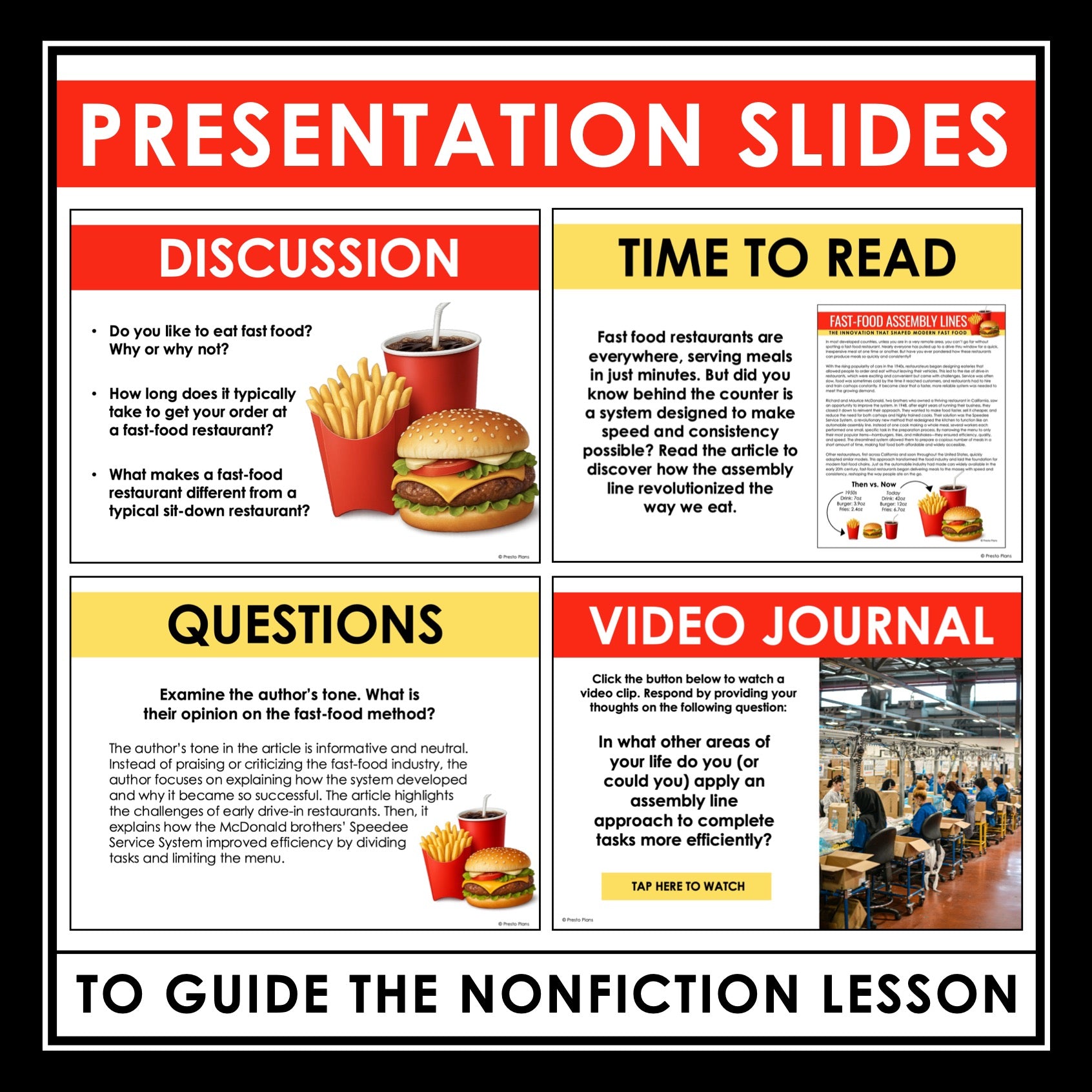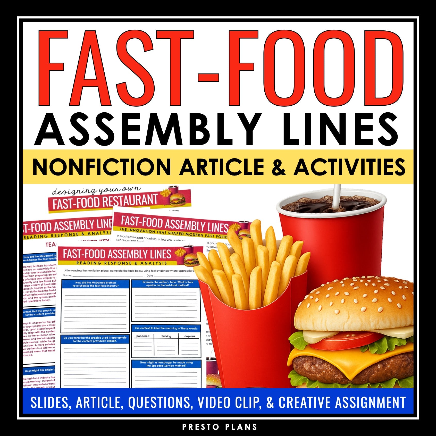 Nonfiction Reading Comprehension Article & Activities - Fast-Food Assembly Lines: Bring nonfiction into your classroom with this comprehensive resource, designed to meet your informational text standards. Use the included presentation slides to guide this high-interest nonfiction reading comprehension lesson where students will read an article about how assembly lines were developed in fast-food restaurants. Students will then show their comprehension and analysis of the article with a ready-to-use response assignment, focusing on finding text evidence, summarizing information, evaluating text features, using context to determine the meaning of vocabulary, analyzing author’s tone, making predictions, and considering different perspectives. Also included is a fun and creative assignment where students must develop their own fast-food restaurant that uses the speedee system described in the article. This nonfiction reading comprehension lesson has everything you need to help your students be stronger at reading and analyzing informational texts.