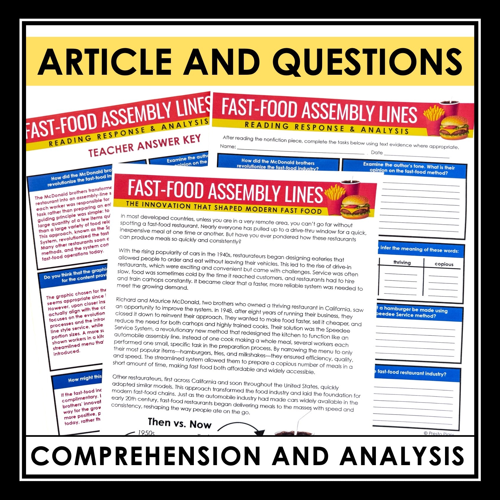 ➡️ Fast-Food Nonfiction Article: Engage your students in an original nonfiction article about how assembly lines were developed in fast food restaurants. This informative piece provides a foundation for in-depth discussions, reading comprehension, and critical analysis.