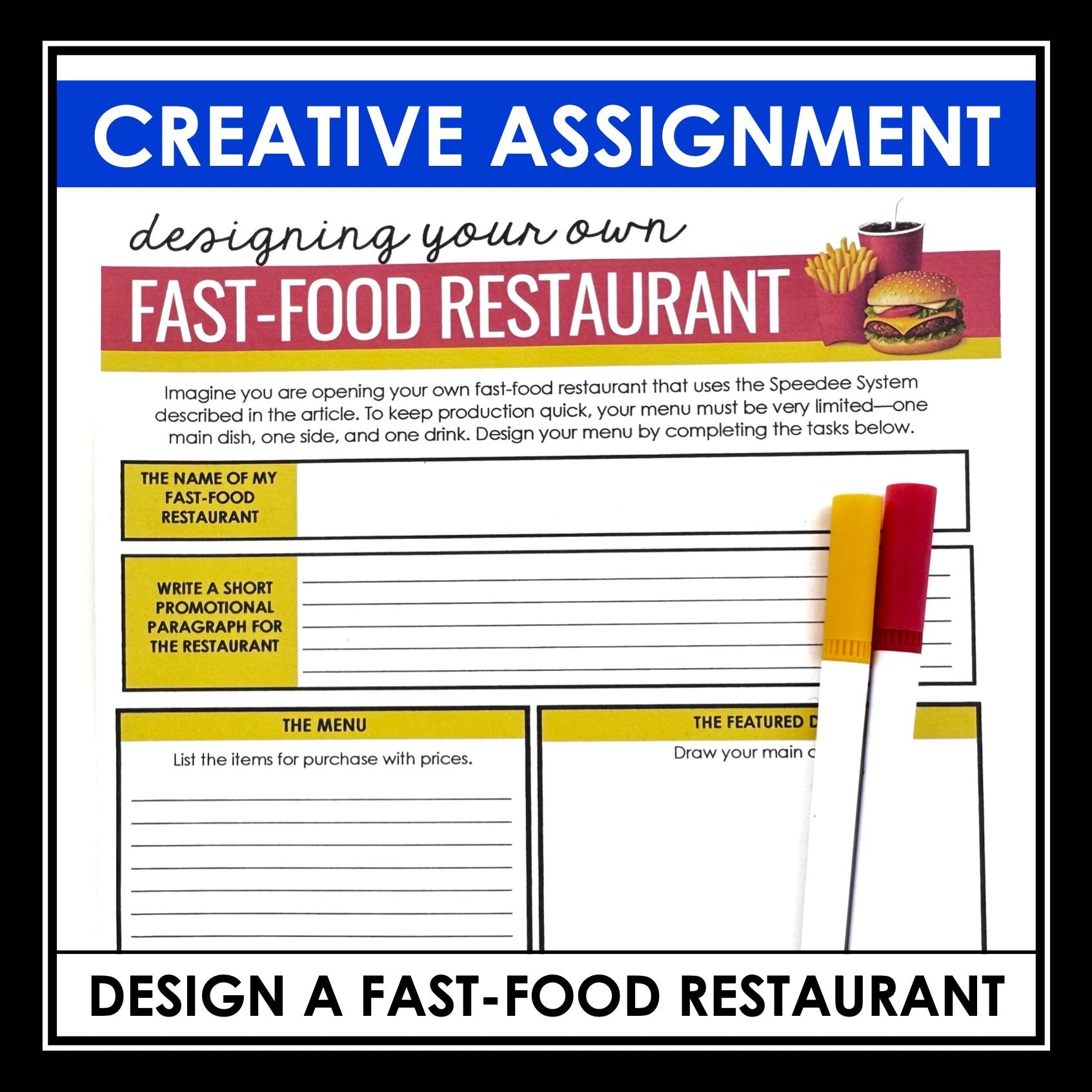 ➡️ Designing Your Own Fast-Food Restaurant Creative Response Assignment: Foster creativity and critical thinking skills with this engaging assignment where students must develop their own fast-food restaurant that uses the speedee system described in the article. They will promote the restaurant and develop a menu with one main dish, one side, and one drink.